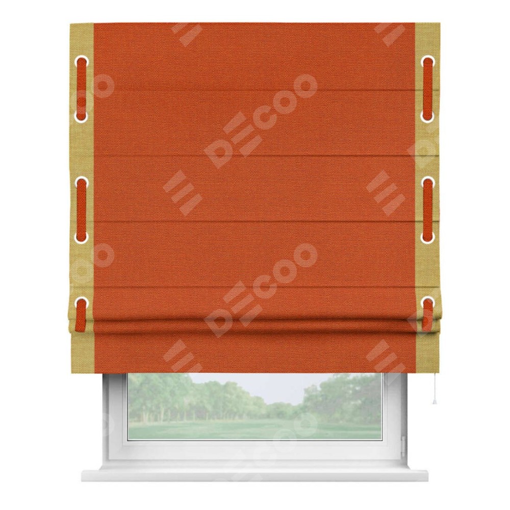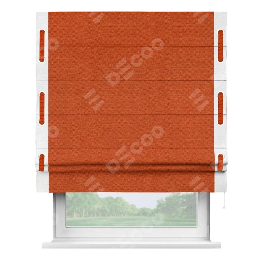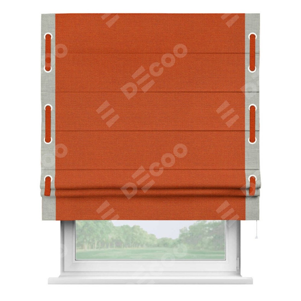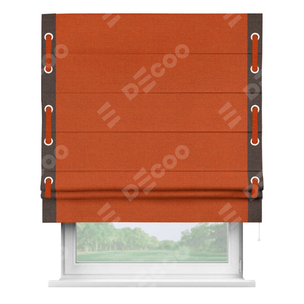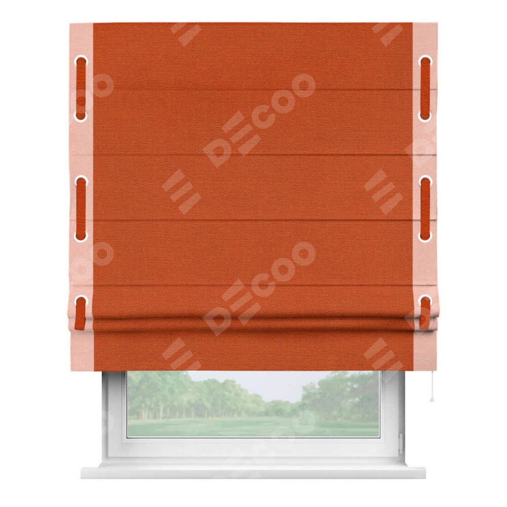 Римская штора производителя «Cortin», используется для проёма, пошита из ткани лён терракотовый, артикул 53440. Отделка шторы кантом «Стрим Дуо» на кантах расположены люверсы с пояском, ткань для канта используется из льна разной расцветки на выбор. Ткань для пояска обычно используется из основной ткани шторы, а так же можно сделать из любой расцветки по желанию. Имеет универсальный механизм и подходит для монтажа: на потолок, на стену и в нишу.