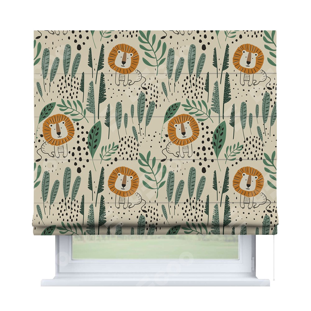 Римская штора производителя «Cortin», используется для проёма, пошита из ткани блэкаут с нанесением сублимационной печати «Лев из джунглей». Имеет универсальный механизм и подходит для монтажа: на потолок, на стену и в нишу.
