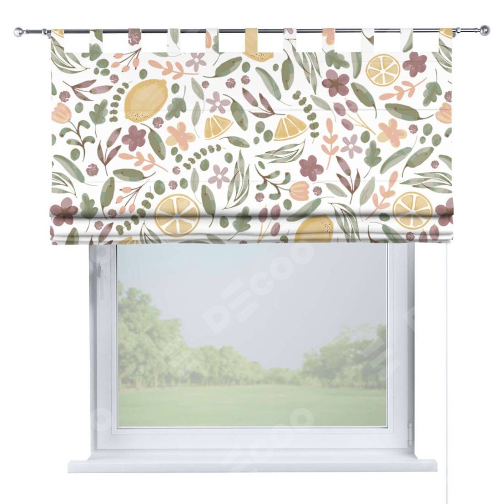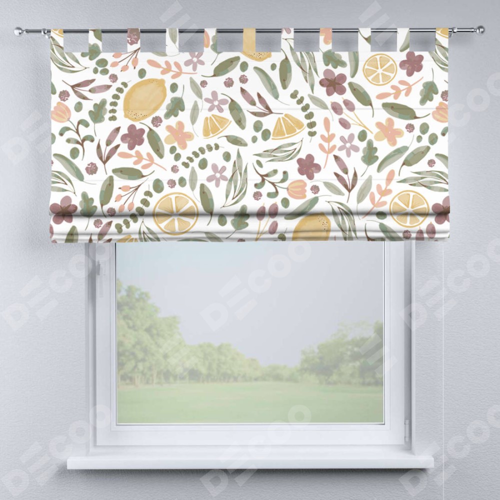 Римская штора производителя «Cortin», используется для проёма, пошита из ткани блэкаут с нанесением сублимационной печати «Лимоны и цветы». Данная модель пошита на петлях, комплектуется на выбор круглым карнизом и подходит для монтажа на стену. Римская штора на петлях имеет простую систему регулировки высоты, отличительным преимуществом данной модели является простой способ монтажа. Достаточно повесить ее на трубу и штора готова!