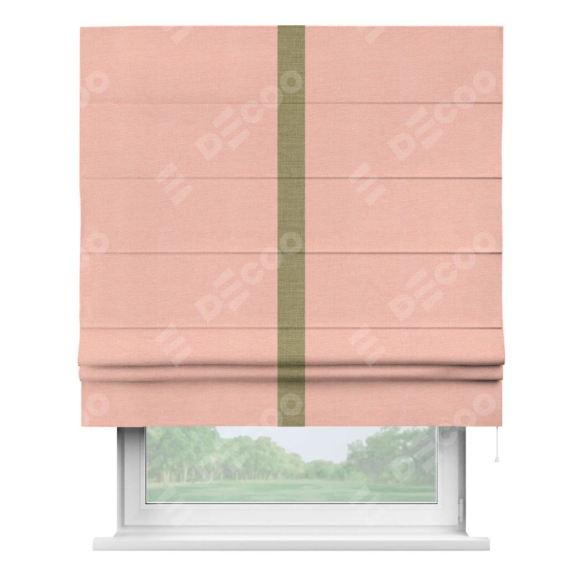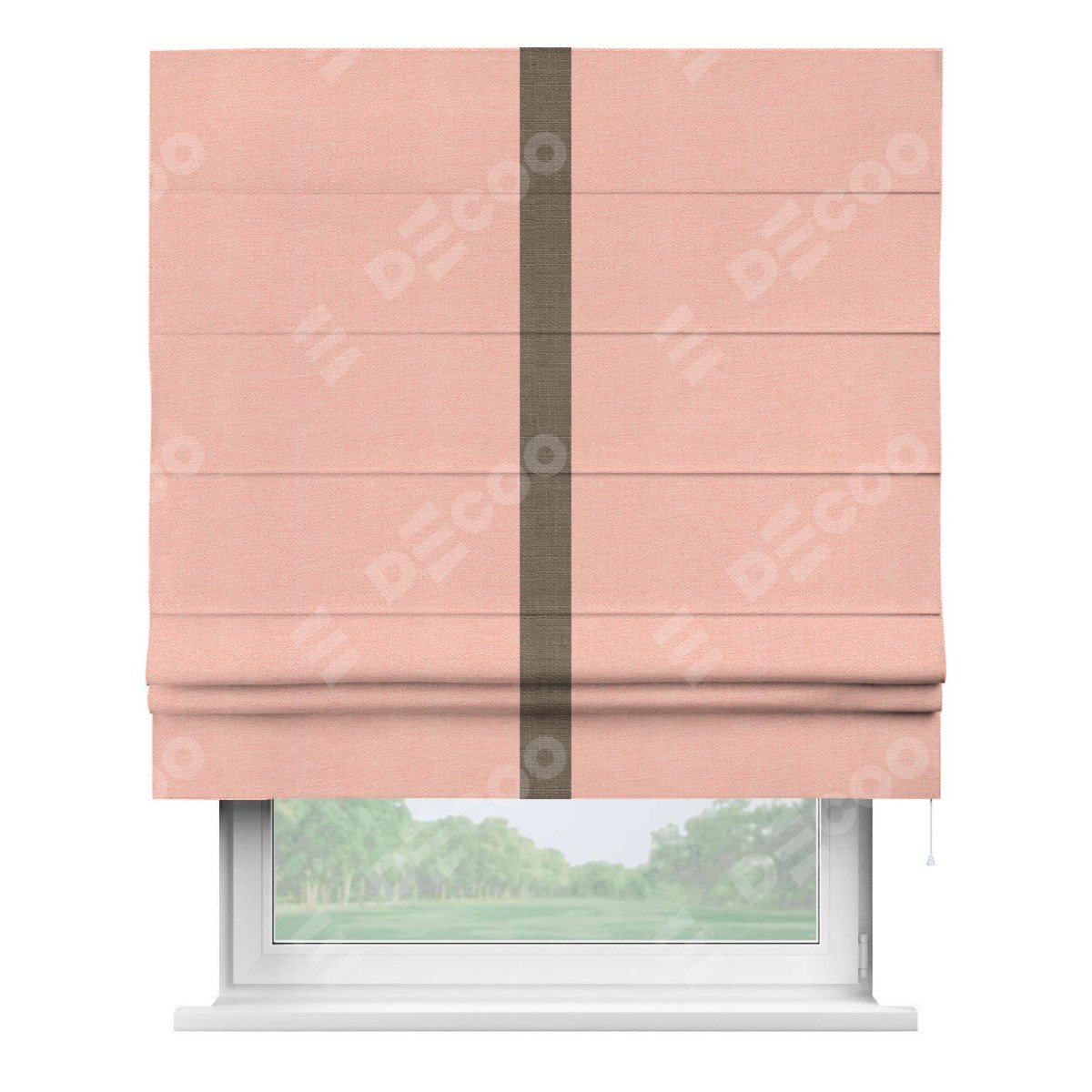 Римская штора производителя «Cortin», используется для проёма, пошита из ткани лён розовый, артикул 00005. Отделка шторы кантом «Хайвэй», ткань для канта используется из льна разной расцветки на выбор. Имеет универсальный механизм и подходит для монтажа: на потолок, на стену и в нишу.