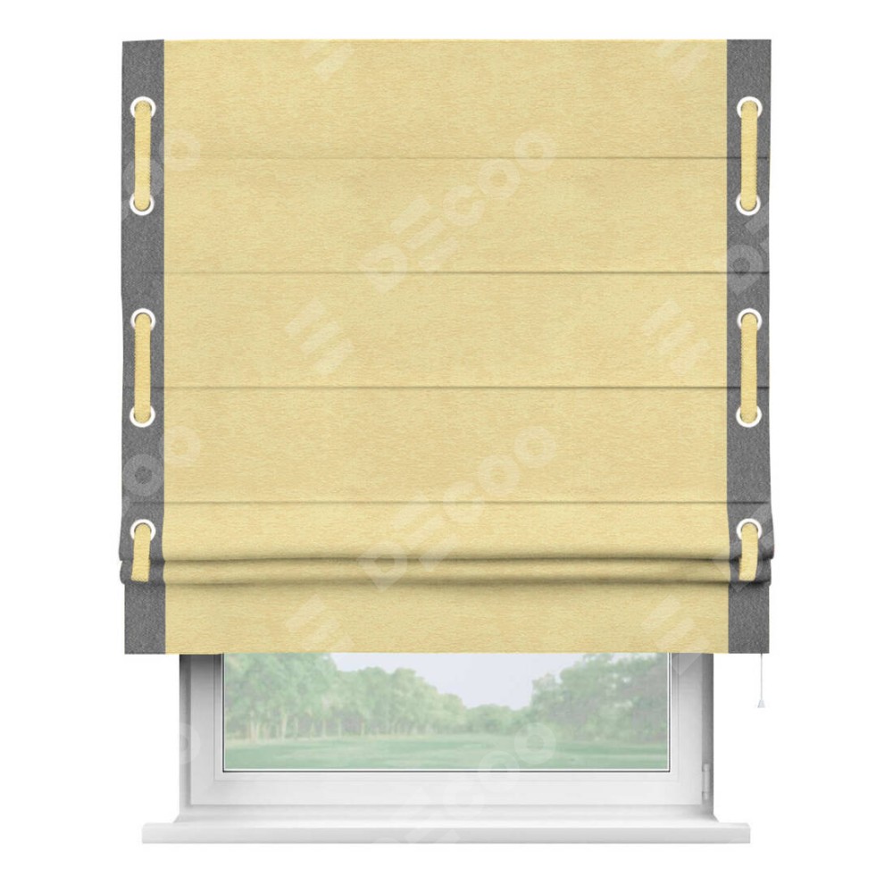 Римская штора производителя «Cortin», используется для проёма, пошита из ткани софт однотонный золотой, артикул 42934. Отделка шторы кантом «Стрим Дуо» на кантах расположены люверсы с пояском, ткань для канта используется из софта разной расцветки на выбор. Ткань для пояска обычно используется из основной ткани шторы, а так же можно сделать из любой расцветки по желанию. Имеет универсальный механизм и подходит для монтажа: на потолок, на стену и в нишу.
