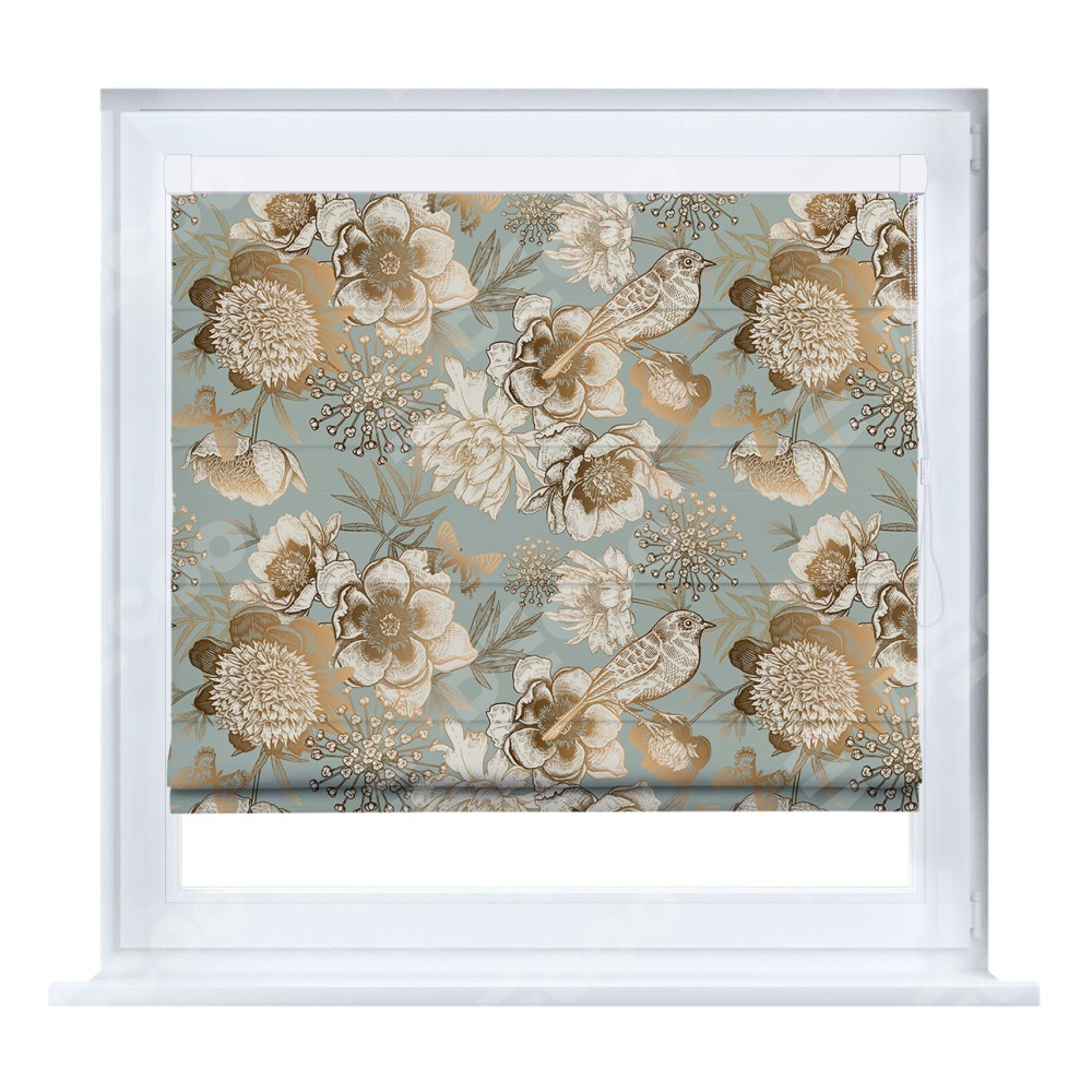 Римская штора кассетного типа, производителя «Cortin», устанавливается только на пластиковые окна и прилегает к стеклопакету, пошита из ткани блэкаут с нанесением сублимационной печати «Садовые цветы».
