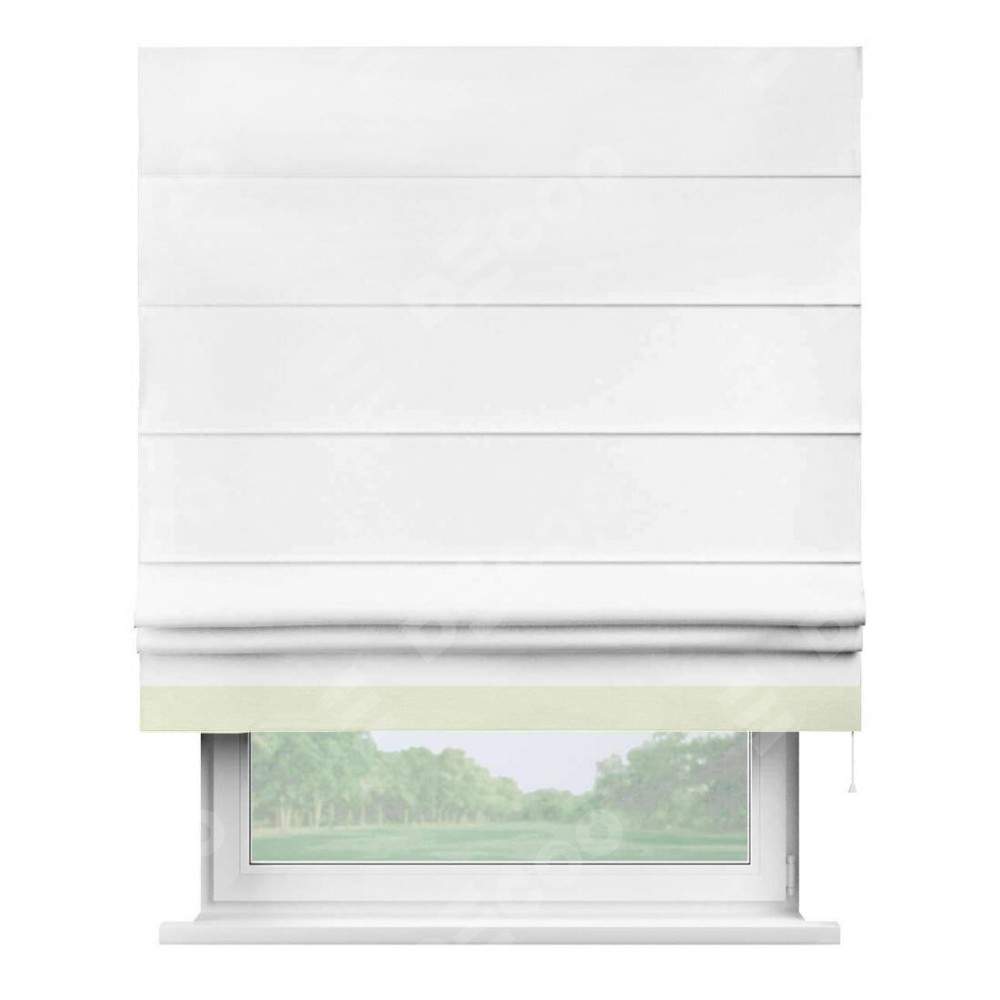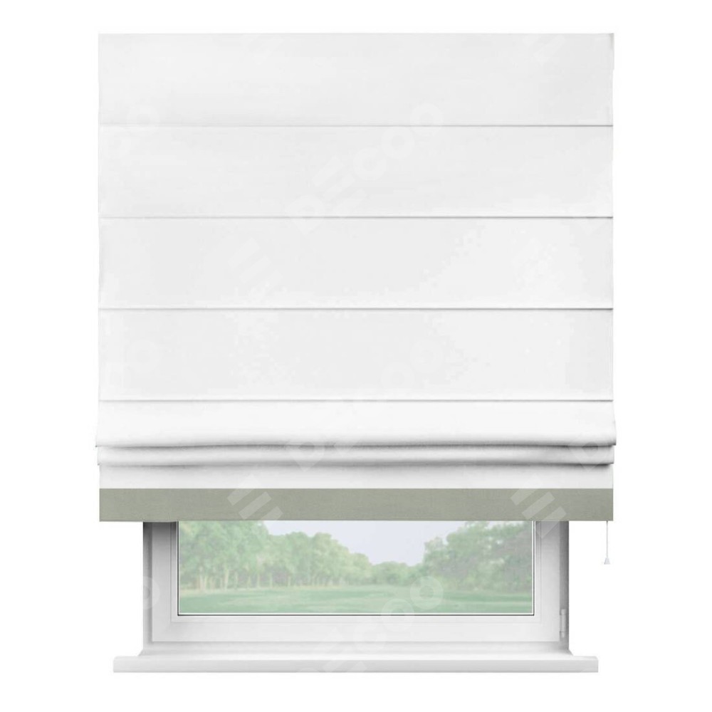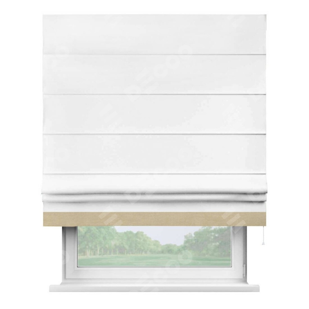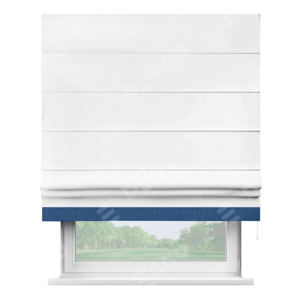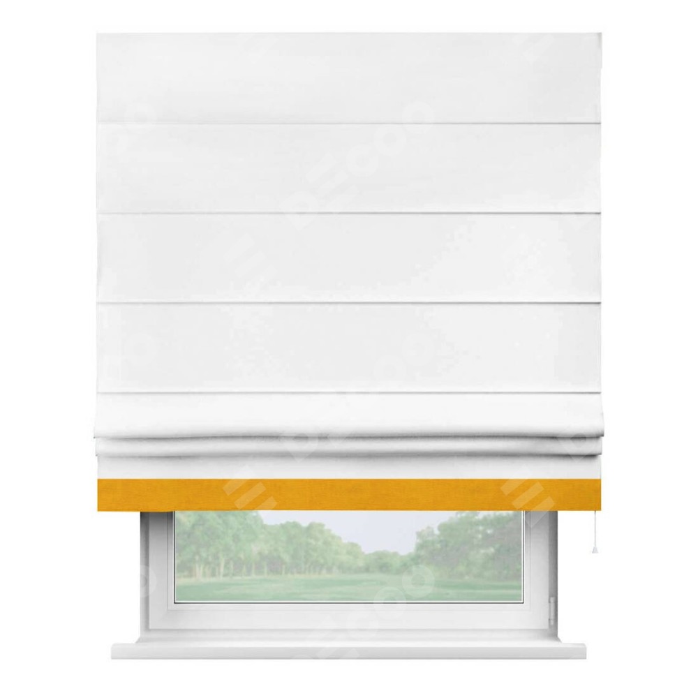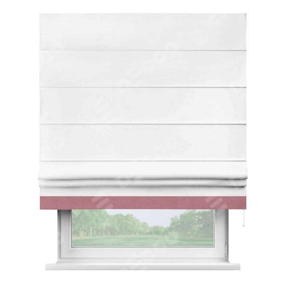 Римская штора производителя «Cortin», используется для проёма, пошита из ткани вельвет белоснежный, артикул ткани 19192. Отделка шторы кантом «Джестер», ткань для канта используется из вельвета разной расцветки на выбор. Имеет универсальный механизм и подходит для монтажа: на потолок, на стену и в нишу.