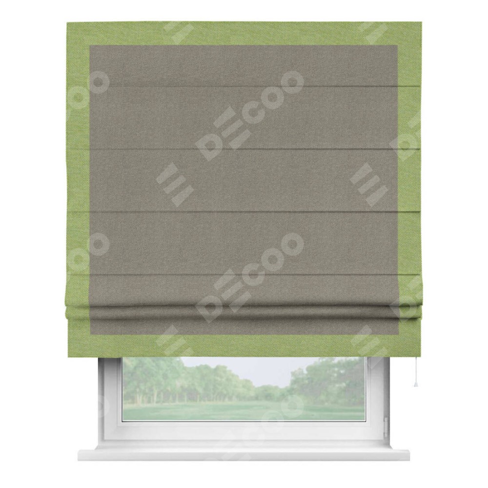 Римская штора производителя «Cortin», используется для проёма, пошита из ткани лён димаут cеро-зелёный, артикул 00003. Отделка шторы кантом «Чесс», ткань для канта используется из льна димаут разной расцветки на выбор. Имеет универсальный механизм и подходит для монтажа: на потолок, на стену и в нишу.