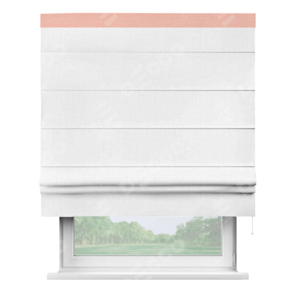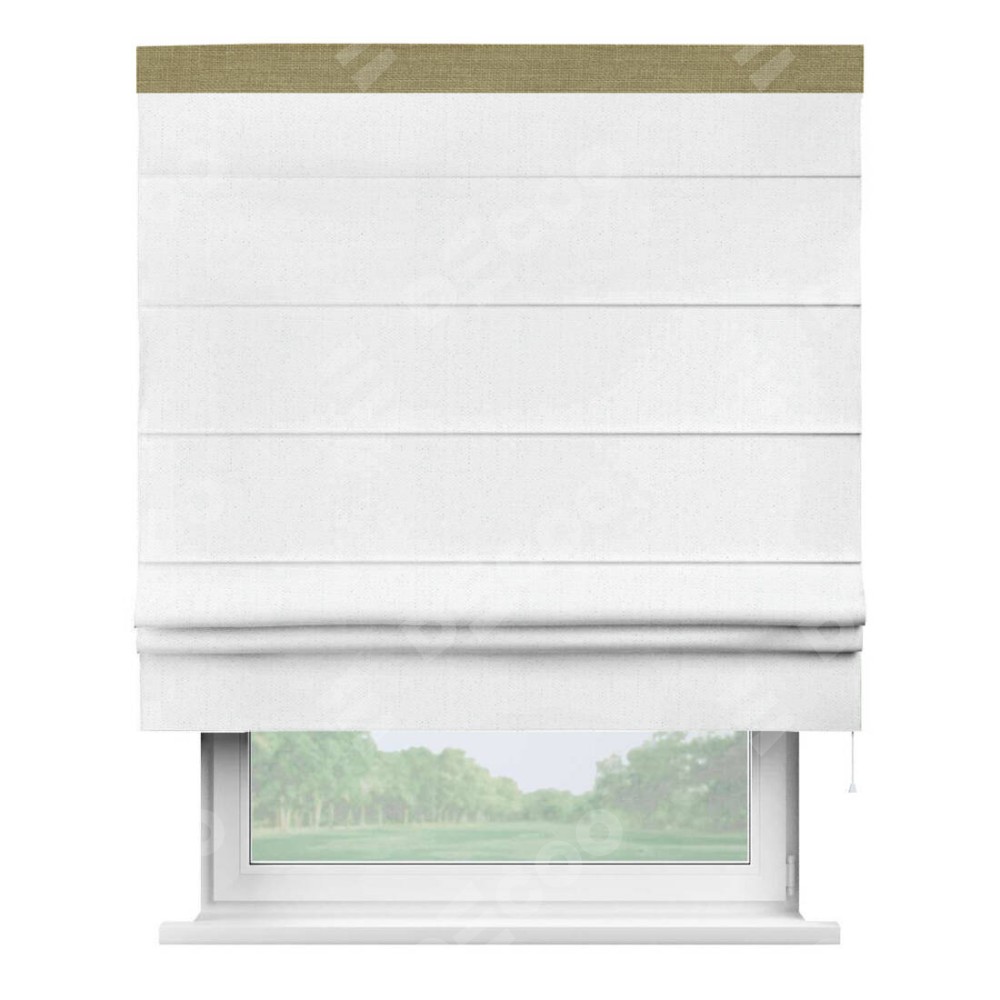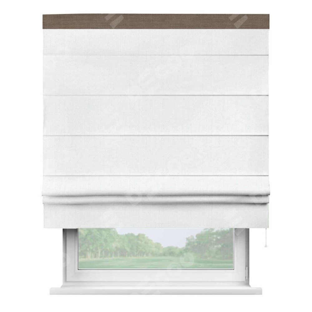 Римская штора производителя «Cortin», используется для проёма, пошита из ткани лён белоснежный, артикул 7438. Отделка шторы кантом «Кинг», ткань для канта используется из льна разной расцветки на выбор. Имеет универсальный механизм и подходит для монтажа: на потолок, на стену и в нишу.