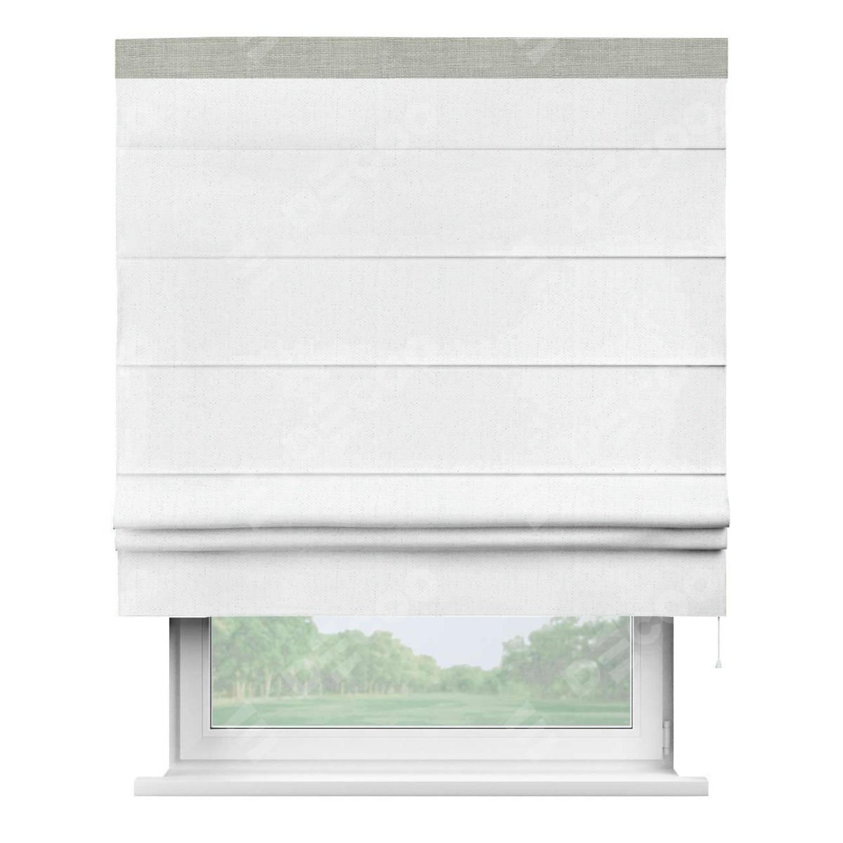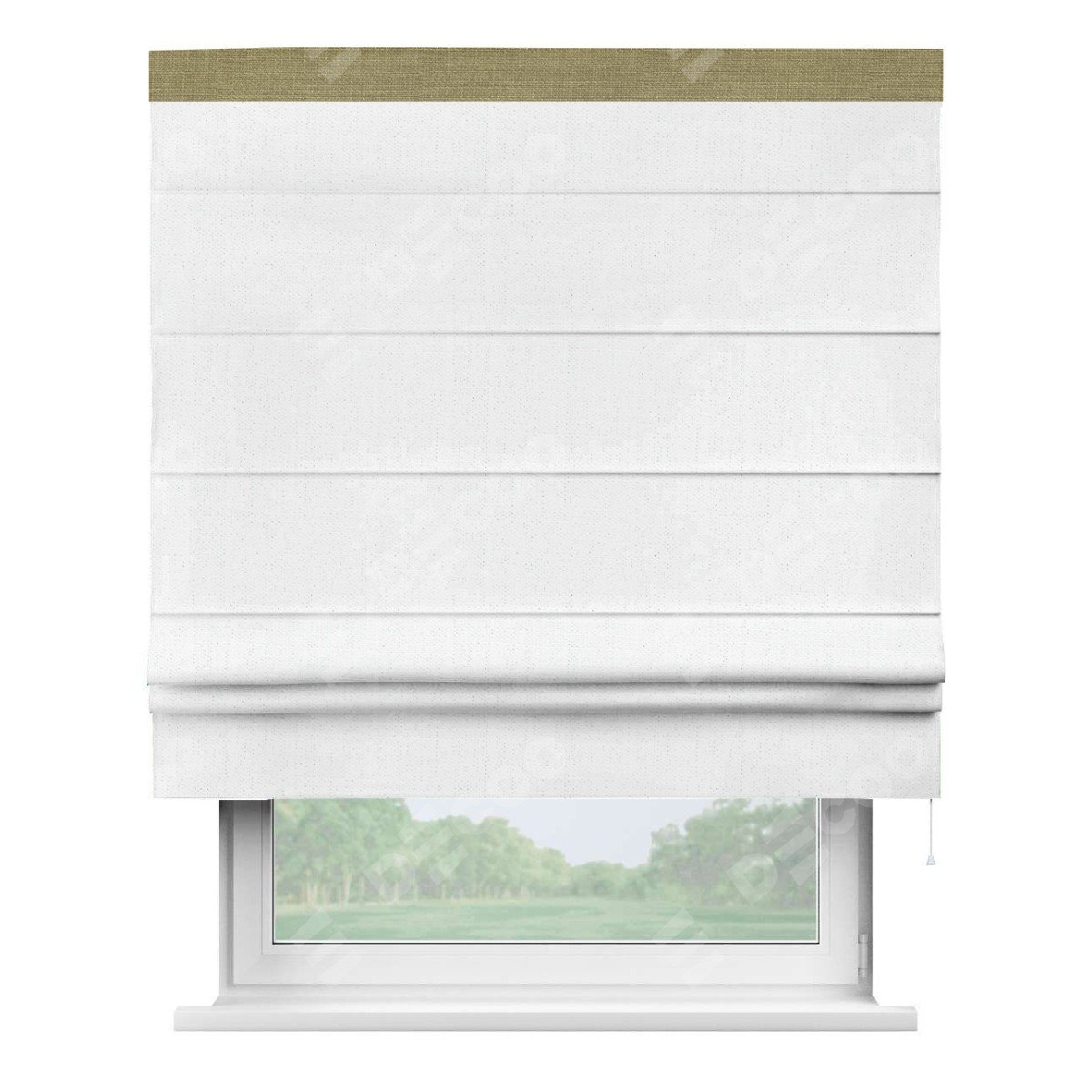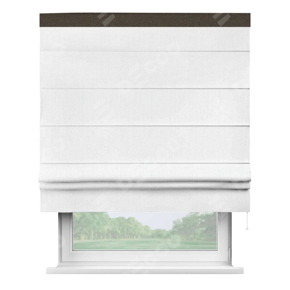 Римская штора производителя «Cortin», используется для проёма, пошита из ткани лён белоснежный, артикул 7438. Отделка шторы кантом «Кинг», ткань для канта используется из льна разной расцветки на выбор. Имеет универсальный механизм и подходит для монтажа: на потолок, на стену и в нишу.