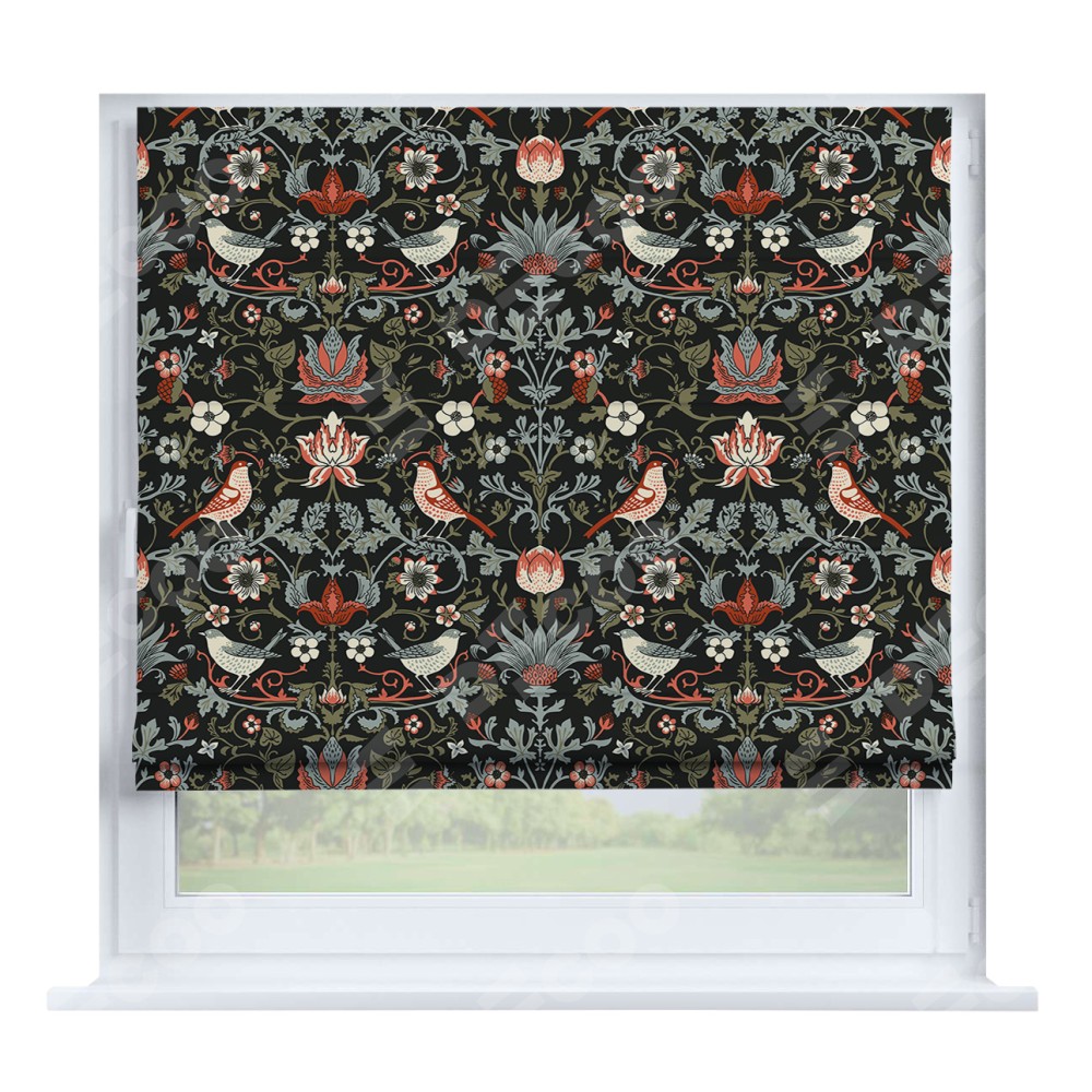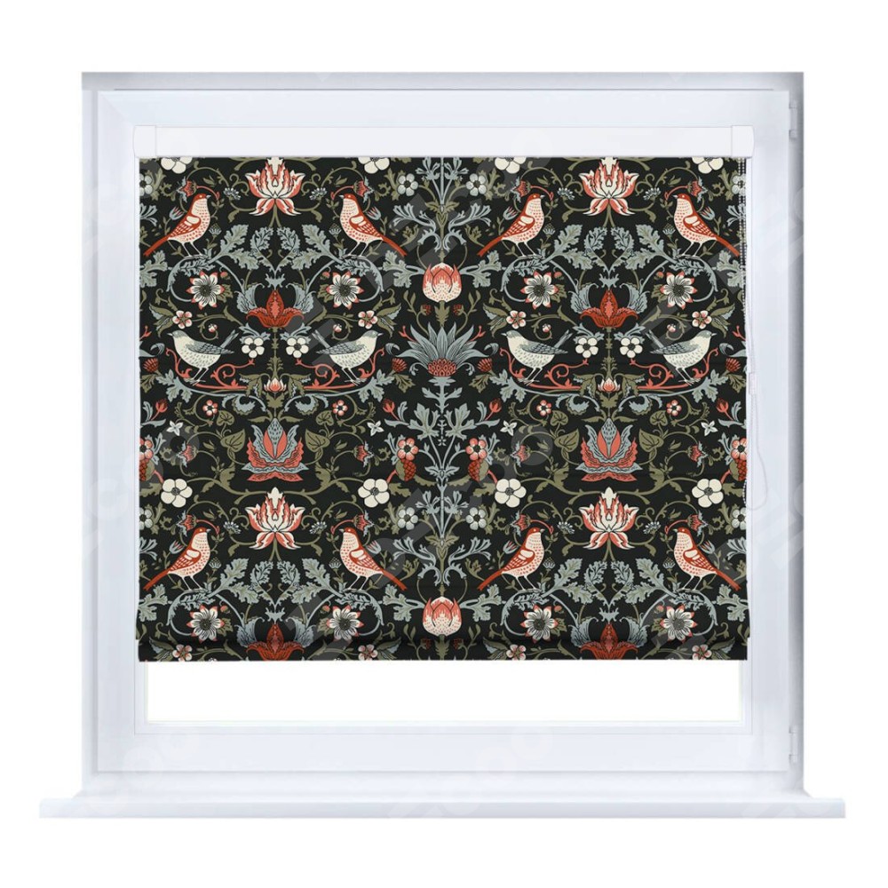 Римская штора производителя «Cortin», устанавливается на створку окна, пошита из ткани блэкаут с нанесением сублимационной печати «Зачарованные птицы». Штора шьётся по индивидуальным размерам, для данного типа римской шторы возможная ширина от 35 до 150 см., высота до 250 см.