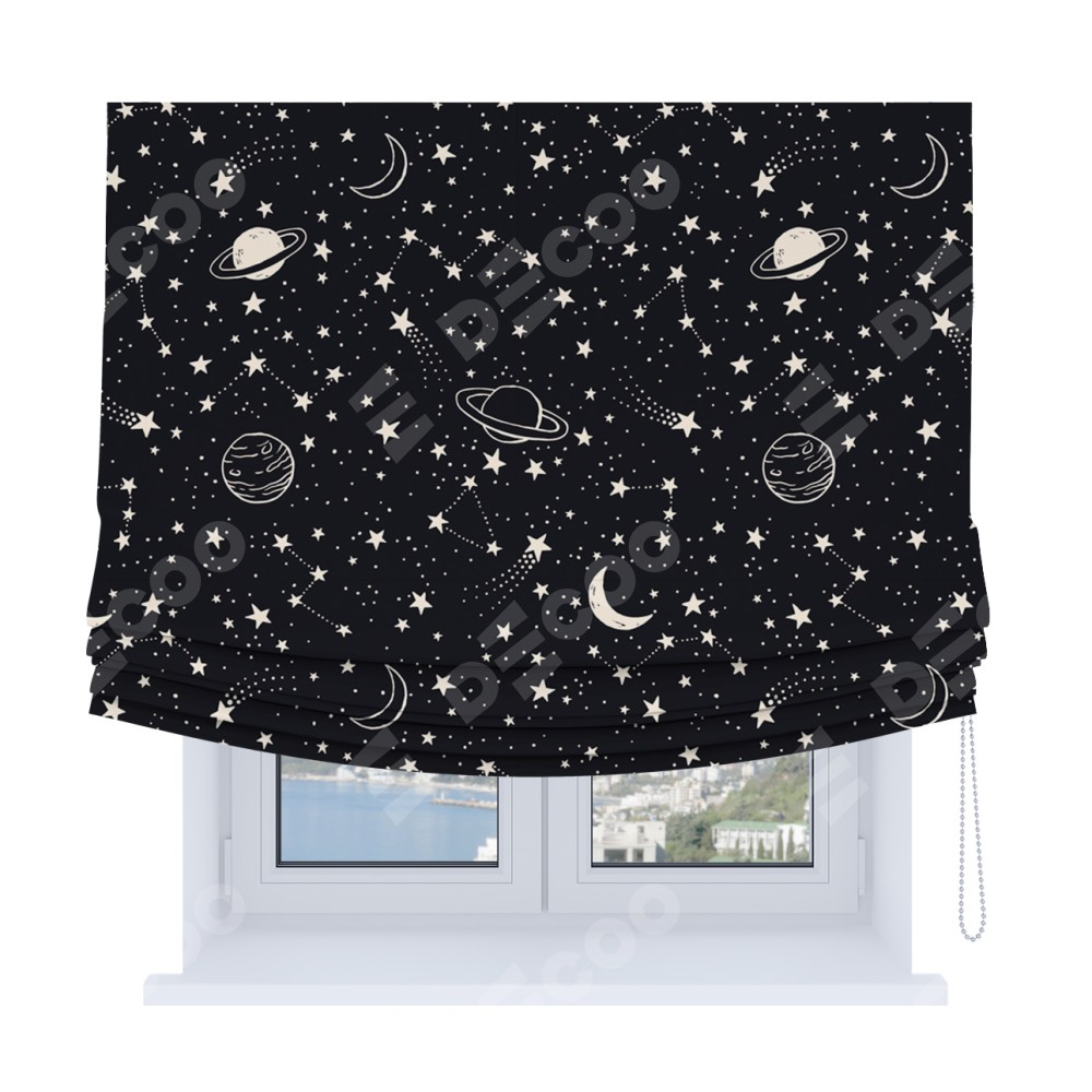 Римская штора Soft производителя «Cortin», используется для проёма, пошита из ткани блэкаут с нанесением сублимационной печати «Глубокий космос». Имеет универсальный механизм и подходит для монтажа: на потолок, на стену и в нишу. В отличие от стандартных римских штор, римская штора Soft не имеет горизонтальных вставок и нижнего отвеса. Это позволяет ткани произвольно драпироваться в свободные мягкие складки.