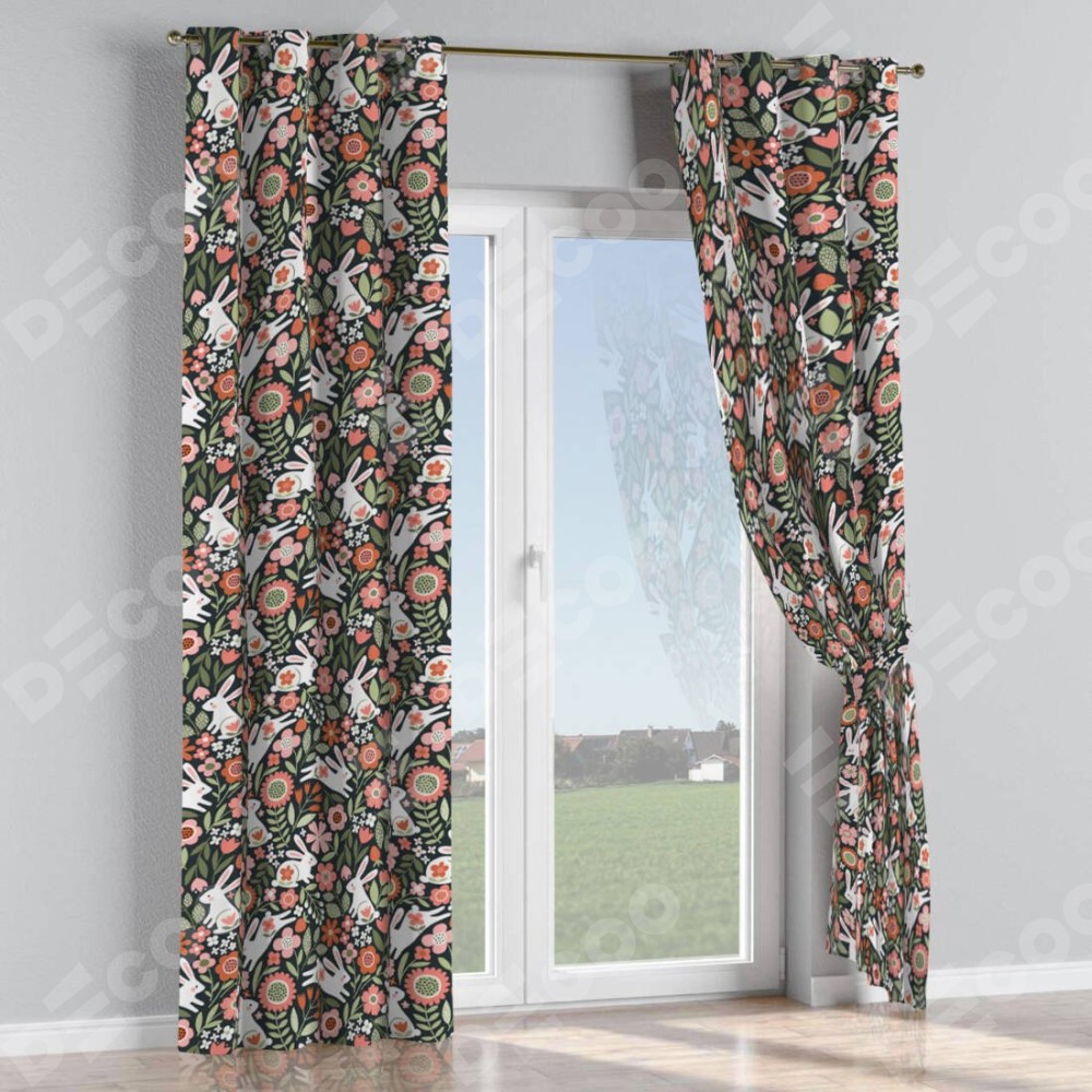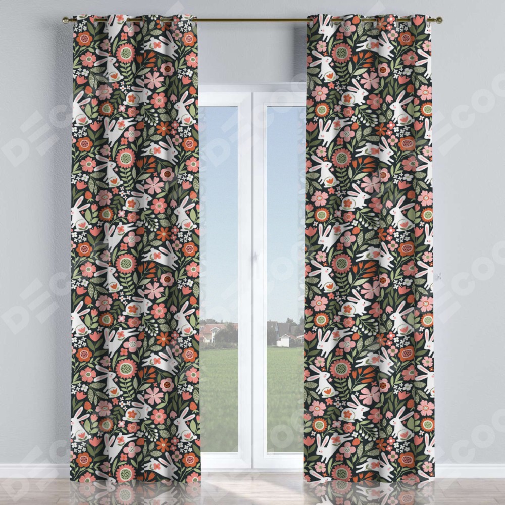 Комплект прямых штор, от производителя «Cortin», пошиты из ткани блэкаут с нанесением сублимационной печати «Зайчики в цветнике». Данная модель пошита на люверсах, комплектуется на выбор круглым карнизом и подходит для монтажа на стену или потолок. Прямые шторы на люверсах шьются по стандарту с коэффициентом 1/2 (на 100 см. ширины проёма 200 см. ширины ткани), отличительным преимуществом данной модели является простой способ монтажа. Достаточно повесить ее на трубу и штора готова!