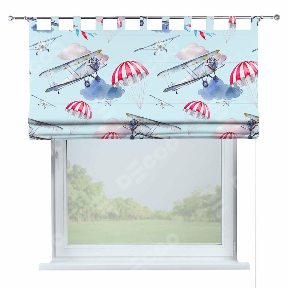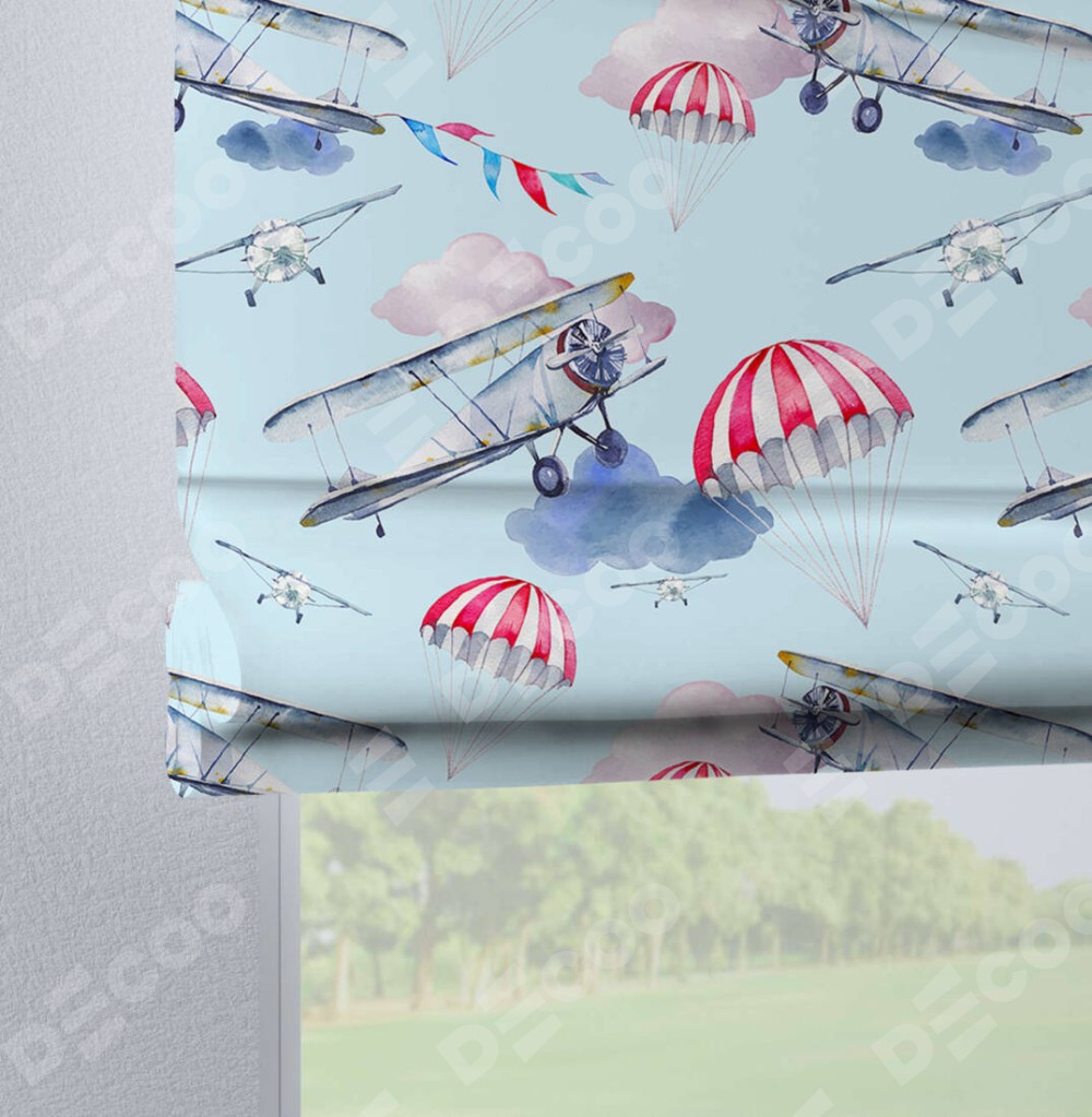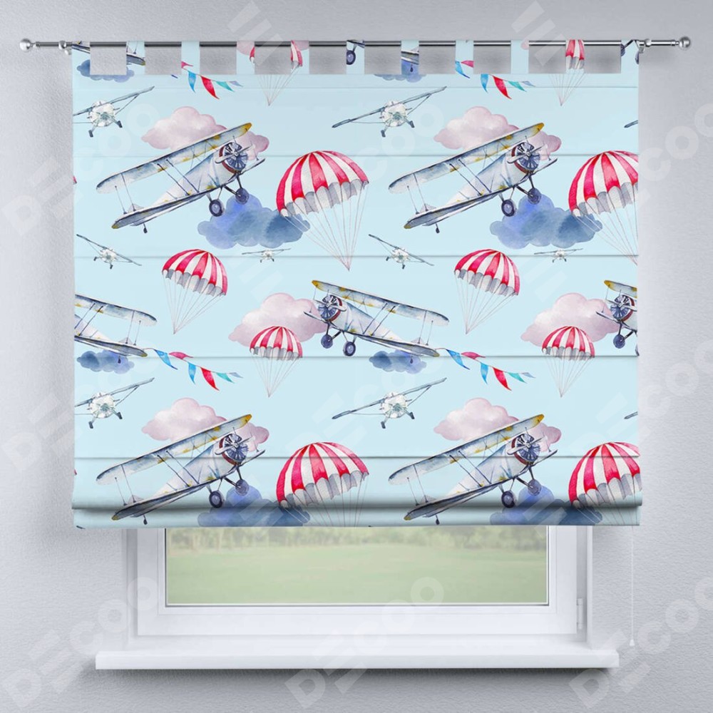 Римская штора производителя «Cortin», используется для проёма, пошита из ткани блэкаут с нанесением сублимационной печати «Самолет». Данная модель пошита на петлях, комплектуется на выбор круглым карнизом и подходит для монтажа на стену. Римская штора на петлях имеет простую систему регулировки высоты, отличительным преимуществом данной модели является простой способ монтажа. Достаточно повесить ее на трубу и штора готова!