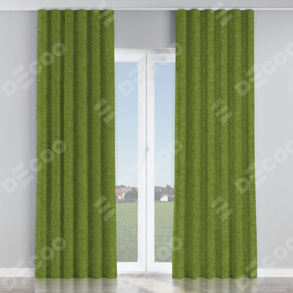 Комплект прямых штор, от производителя «Cortin», пошиты из ткани рогожка димаут салатовый, артикул ткани 80423. С изнаночной стороны в верхней части штор пристрачивается шторная лента с декоративными складками «Волна». Для создания элегантных складок прямые шторы шьются по стандарту с коэффициентом 1:2 (на 100 см. ширины проёма 200 см. ширины ткани).