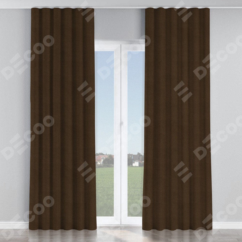 Комплект прямых штор, от производителя «Cortin», пошиты из ткани вельвет тёмно-коричневый, артикул ткани 30991. С изнаночной стороны в верхней части штор пристрачивается шторная лента с декоративными складками «Волна». Для создания элегантных складок прямые шторы шьются по стандарту с коэффициентом 1:2 (на 100 см. ширины проёма 200 см. ширины ткани).
