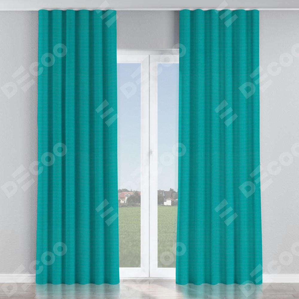 Комплект прямых штор, от производителя «Cortin», пошиты из ткани блэкаут однотонный бирюзовый, артикул ткани 88297. С изнаночной стороны в верхней части штор пристрачивается шторная лента с декоративными складками «Волна». Для создания элегантных складок прямые шторы шьются по стандарту с коэффициентом 1:2 (на 100 см. ширины проёма 200 см. ширины ткани).