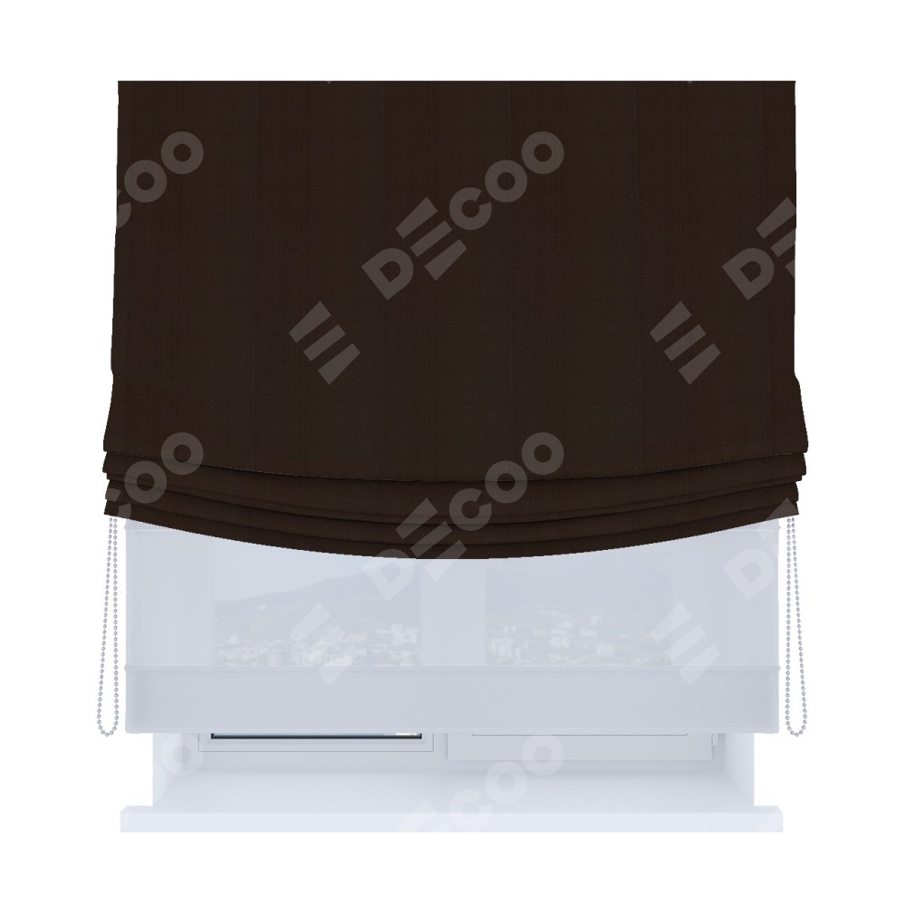 Римская штора день-ночь производителя «Cortin», используется для проёма, пошита из двух полотен, с лицевой стороны блэкаут однотонный тёмно-коричневый артикул 88287, вторая ткань тюль (по стандарту комплектуется тюль белого цвета артикул V-01). Имеет универсальный механизм и подходит для монтажа: на потолок, на стену и в нишу. Удобное управление каждой шторой отдельно.