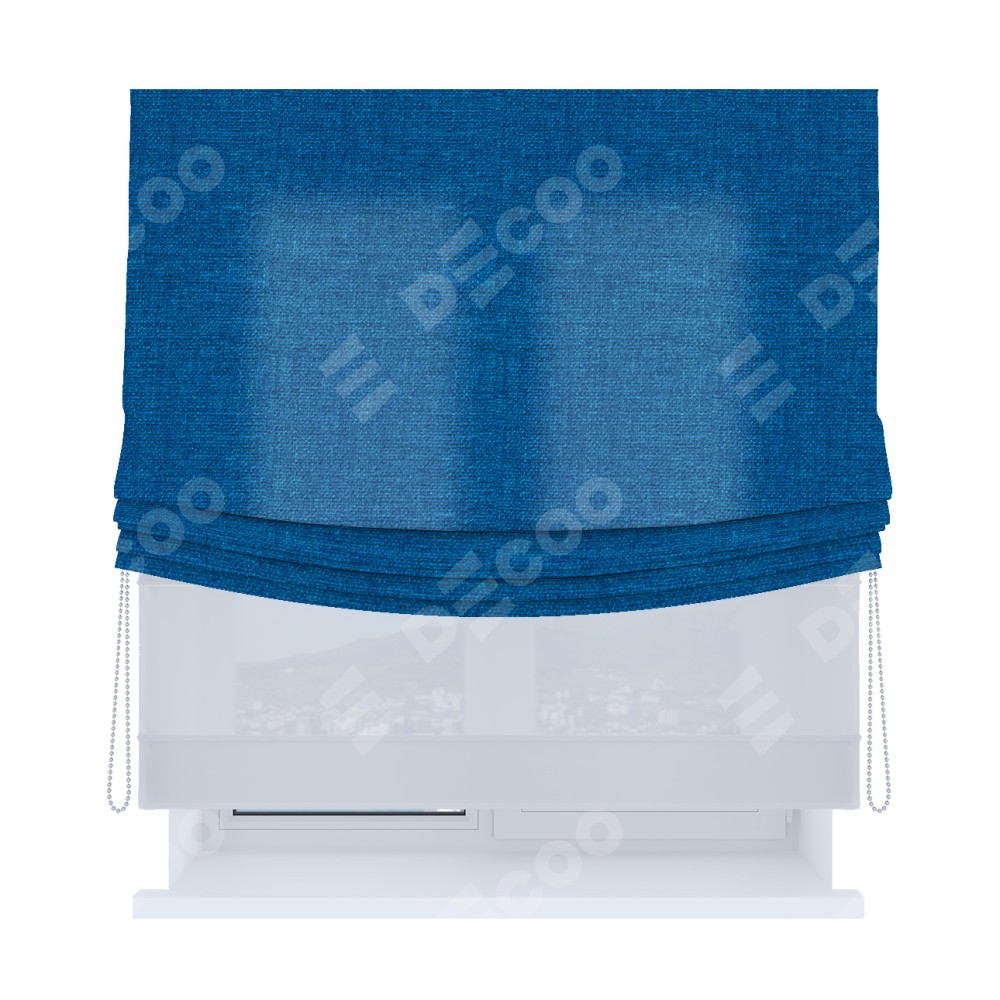 Римская штора день-ночь (двойная) от производителя «Cortin», используется для проёма. Пошита из двух полотен, основная ткань лён синий артикул 63742, вторая ткань тюль (по стандарту используется тюль белого цвета артикул V-01). Имеет универсальный механизм и подходит для монтажа: на потолок, на стену и в нишу. Удобное управление каждой шторой отдельно.