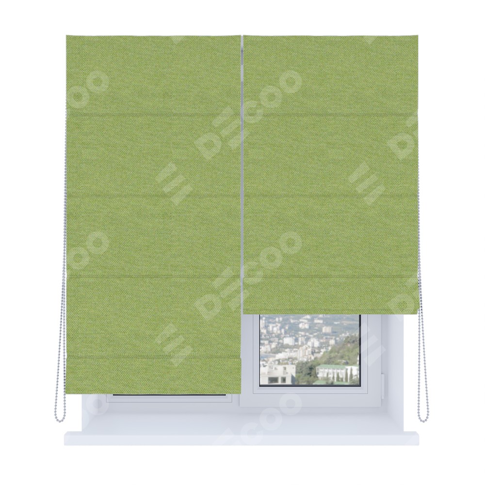 Римская штора производителя «Cortin», используется для проёма, пошита из ткани лён димаут салатовый, артикул ткани 83032. Имеет универсальный механизм и подходит для монтажа: на потолок, на стену и в нишу. Удобное управление каждой шторой отдельно.