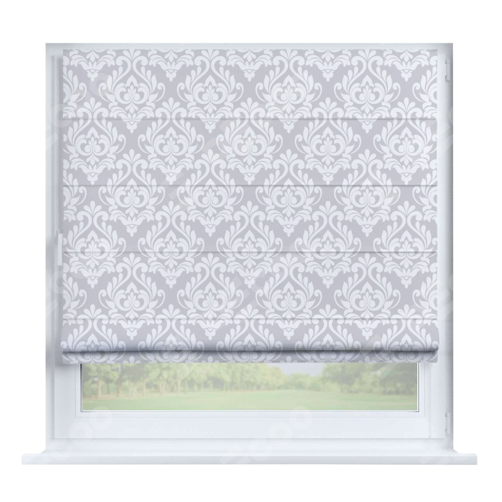 Римская штора производителя «Cortin», устанавливается на створку окна, пошита из ткани блэкаут с нанесением сублимационной печати «Дамаск светлый». Штора шьётся по индивидуальным размерам, для данного типа римской шторы возможная ширина от 35 до 150 см., высота до 250 см.
