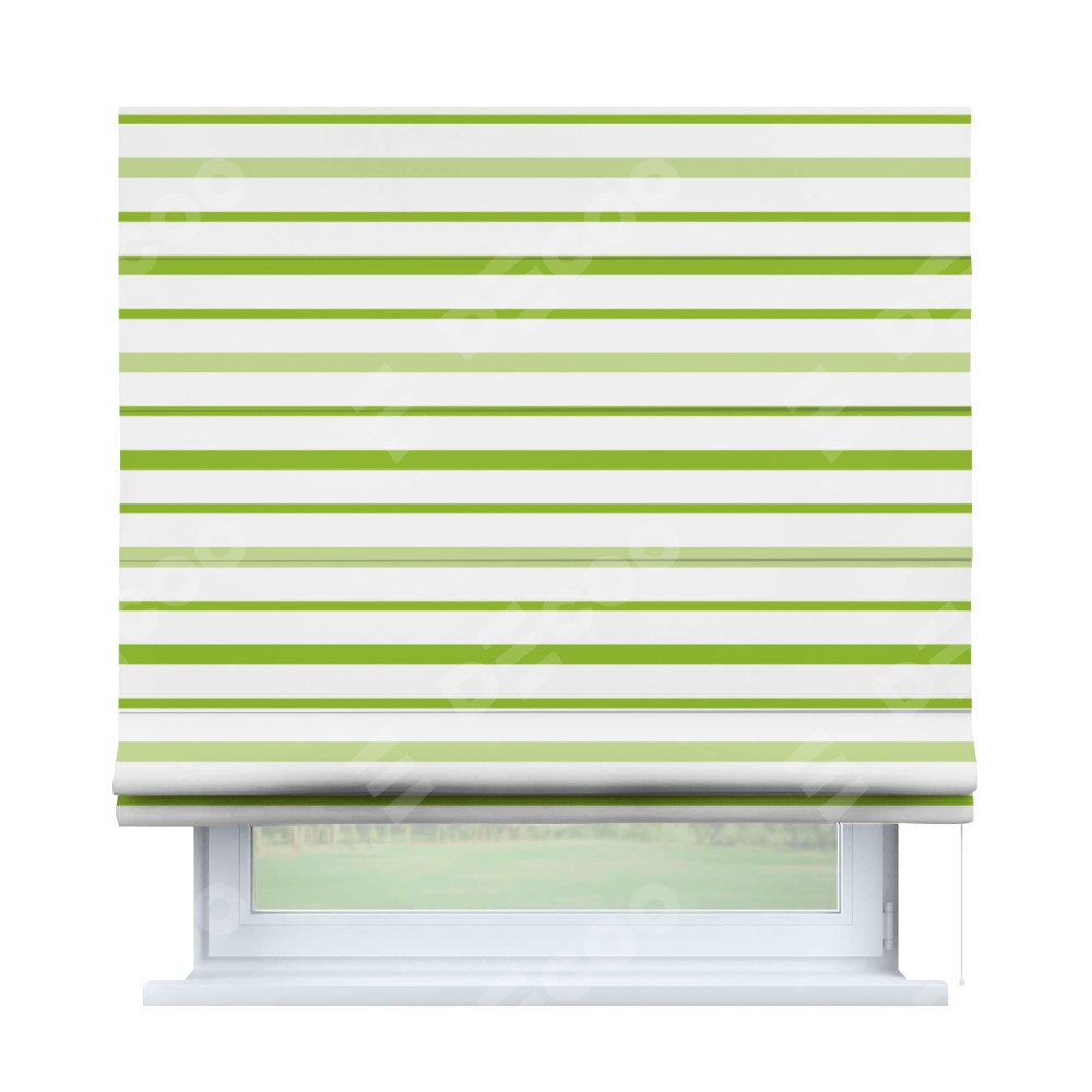 Римская штора производителя «Cortin», используется для проёма, пошита из ткани блэкаут с нанесением сублимационной печати «Зелёные горизонтальные полоски». Имеет универсальный механизм и подходит для монтажа: на потолок, на стену и в нишу.