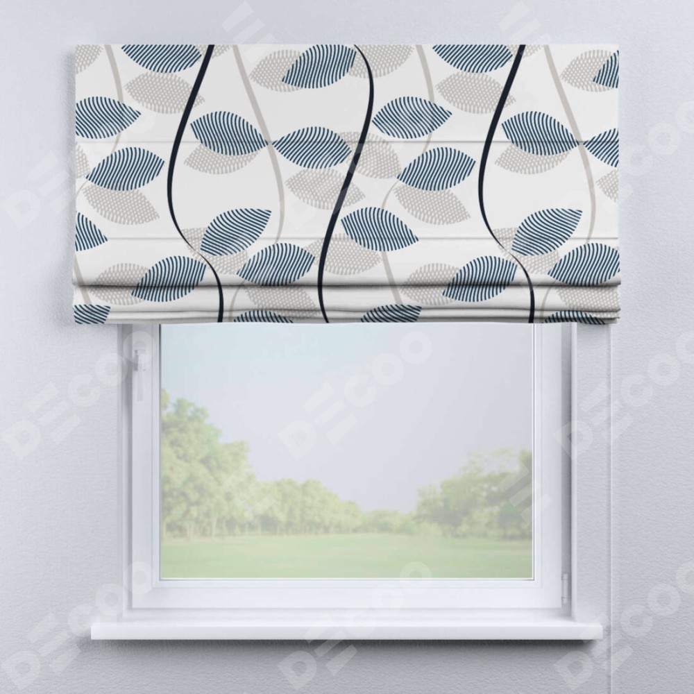 Римская штора производителя «Cortin», используется для проёма, пошита из ткани блэкаут с нанесением сублимационной печати «Резные листья». Имеет универсальный механизм и подходит для монтажа: на потолок, на стену и в нишу.