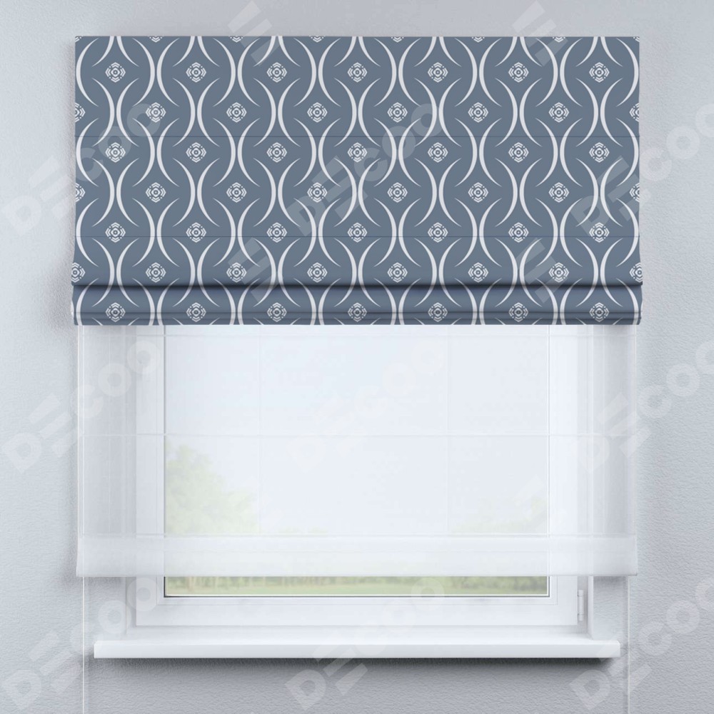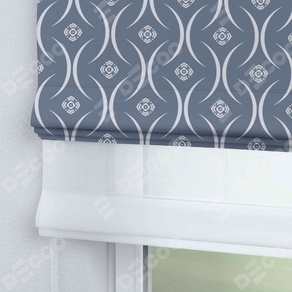 Римская штора день-ночь производителя «Cortin», используется для проёма, пошита из двух полотен, с лицевой блэкаут с нанесением сублимационной печати «Воздушный узор серый», вторая ткань тюль (по стандарту комплектуется тюль белого цвета артикул V-01). Имеет универсальный механизм и подходит для монтажа: на потолок, на стену и в нишу.