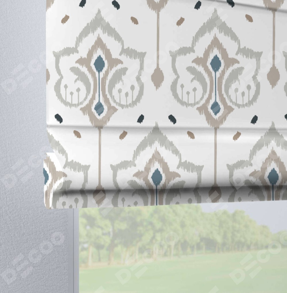 Римская штора производителя «Cortin», используется для проёма, пошита из ткани блэкаут с нанесением сублимационной печати «Икат узор». Данная модель пошита на петлях, комплектуется на выбор круглым карнизом и подходит для монтажа на стену. Римская штора на петлях имеет простую систему регулировки высоты, отличительным преимуществом данной модели является простой способ монтажа. Достаточно повесить ее на трубу и штора готова!