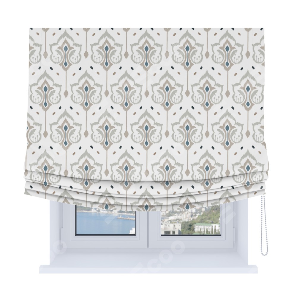 Римская штора Soft производителя «Cortin», используется для проёма, пошита из ткани блэкаут с нанесением сублимационной печати «Икат узор». Имеет универсальный механизм и подходит для монтажа: на потолок, на стену и в нишу. В отличие от стандартных римских штор, римская штора Soft не имеет горизонтальных вставок и нижнего отвеса. Это позволяет ткани произвольно драпироваться в свободные мягкие складки.