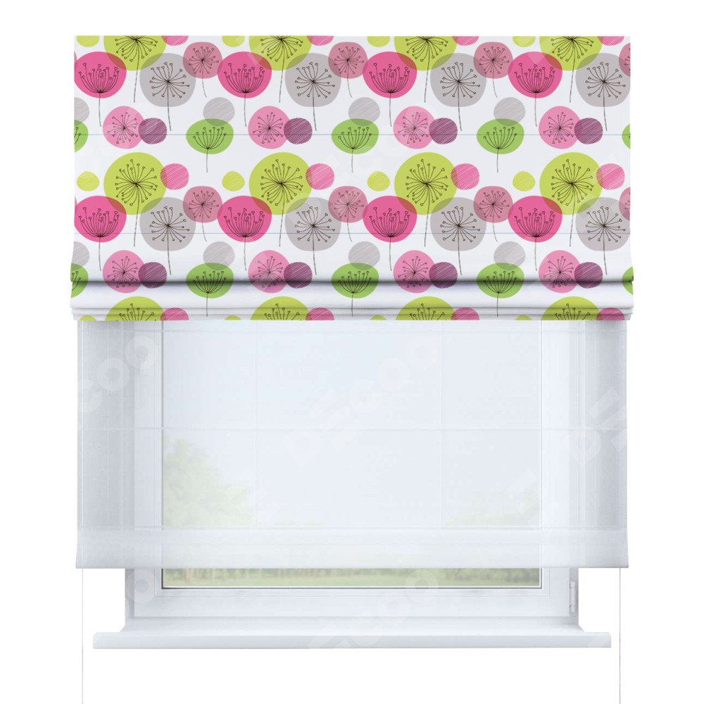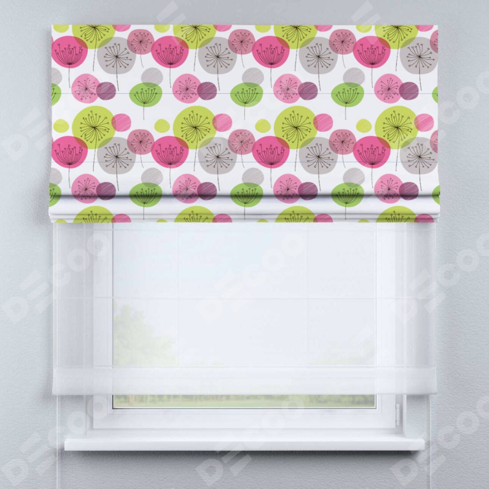 Римская штора день-ночь производителя «Cortin», используется для проёма, пошита из двух полотен, с лицевой блэкаут с нанесением сублимационной печати «Цветные одуванчики», вторая ткань тюль (по стандарту комплектуется тюль белого цвета артикул V-01). Имеет универсальный механизм и подходит для монтажа: на потолок, на стену и в нишу.