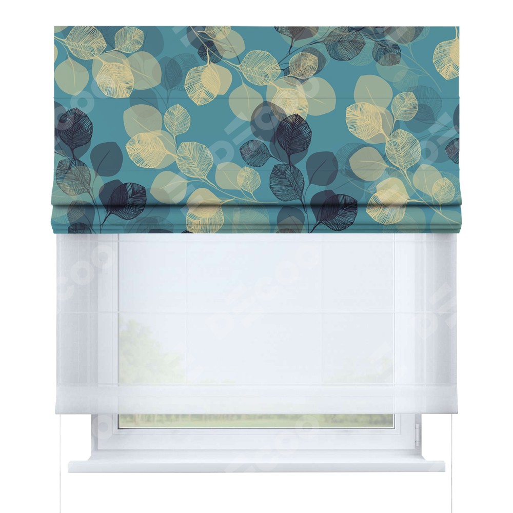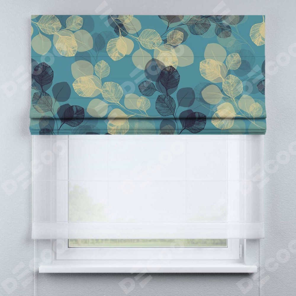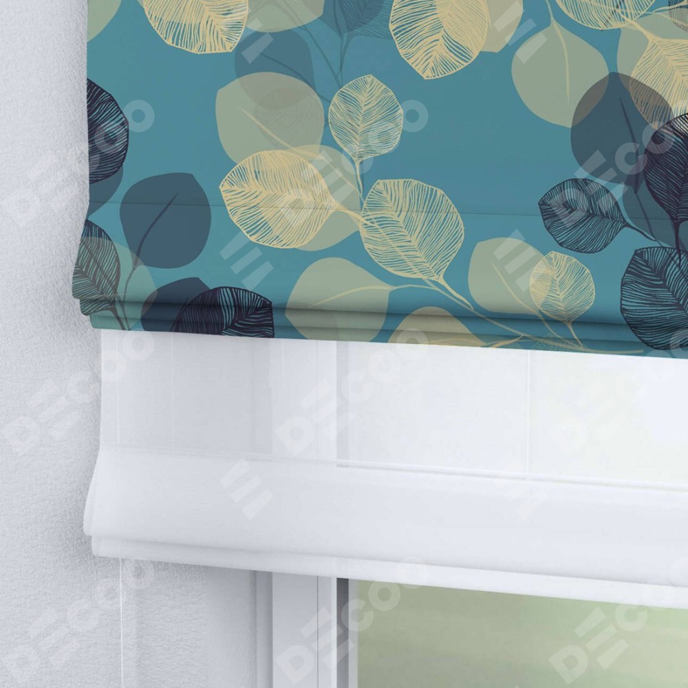 Римская штора день-ночь производителя «Cortin», используется для проёма, пошита из двух полотен, с лицевой блэкаут с нанесением сублимационной печати «Листья в небе», вторая ткань тюль (по стандарту комплектуется тюль белого цвета артикул V-01). Имеет универсальный механизм и подходит для монтажа: на потолок, на стену и в нишу.