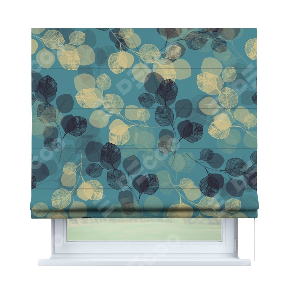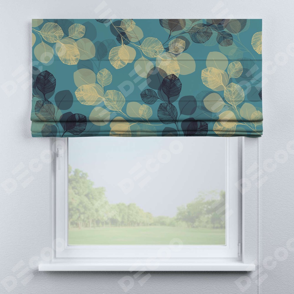 Римская штора производителя «Cortin», используется для проёма, пошита из ткани блэкаут с нанесением сублимационной печати «Листья в небе». Имеет универсальный механизм и подходит для монтажа: на потолок, на стену и в нишу.