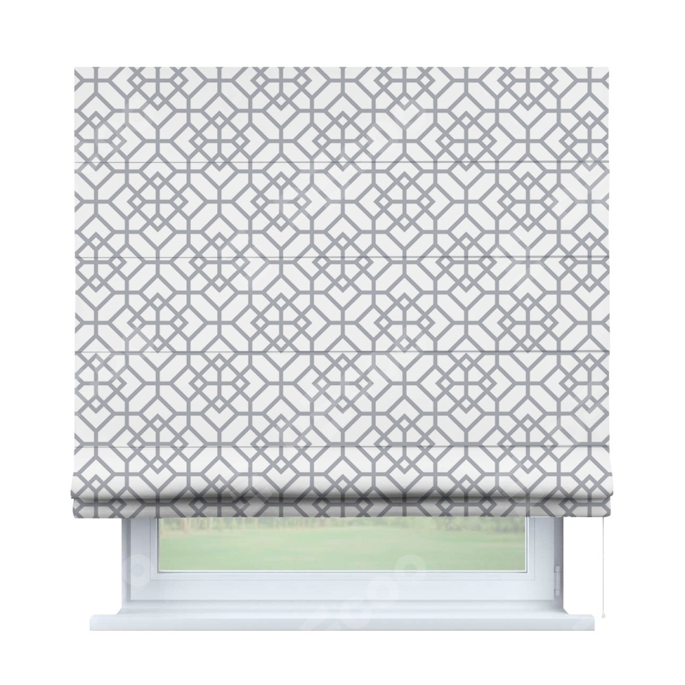 Римская штора производителя «Cortin», используется для проёма, пошита из ткани блэкаут с нанесением сублимационной печати «Архитектурный орнамент». Имеет универсальный механизм и подходит для монтажа: на потолок, на стену и в нишу.