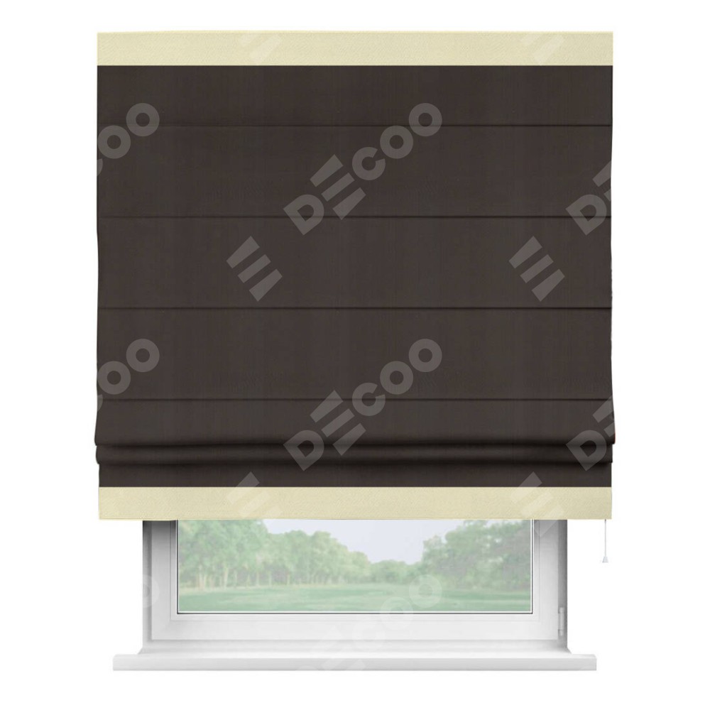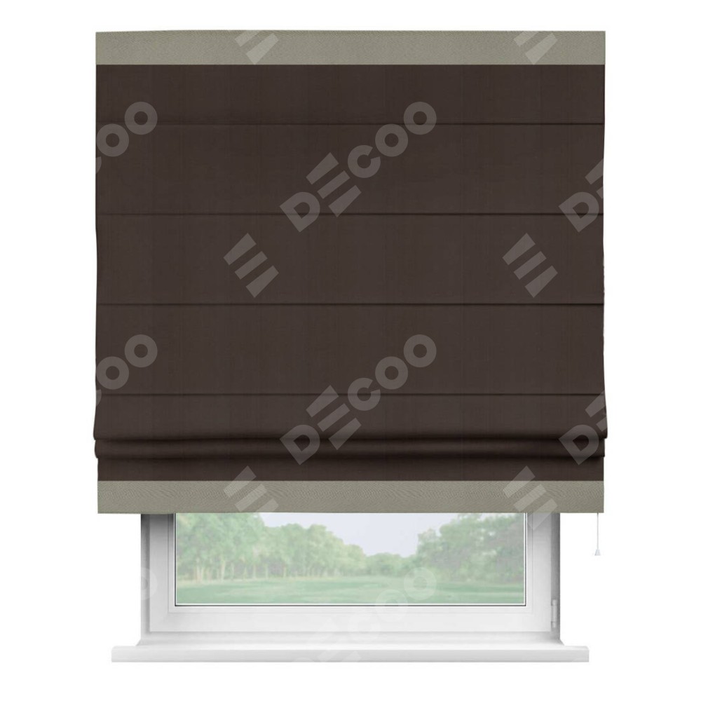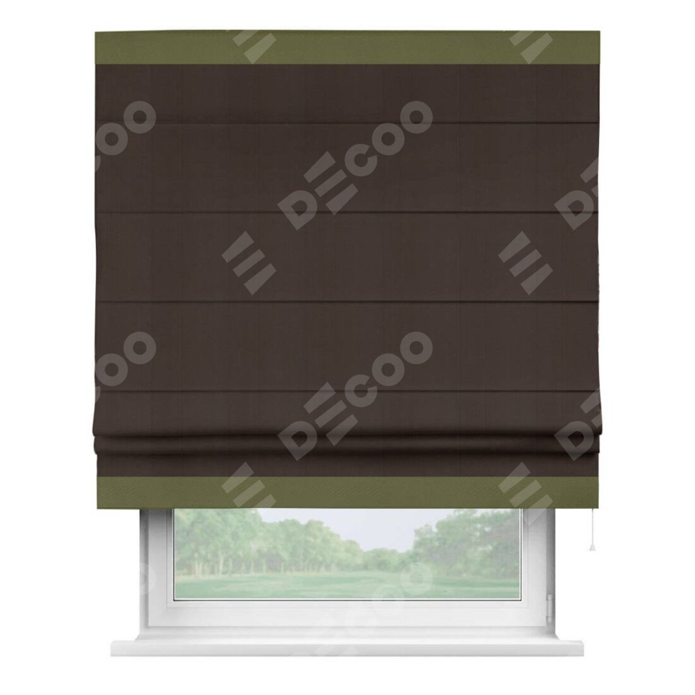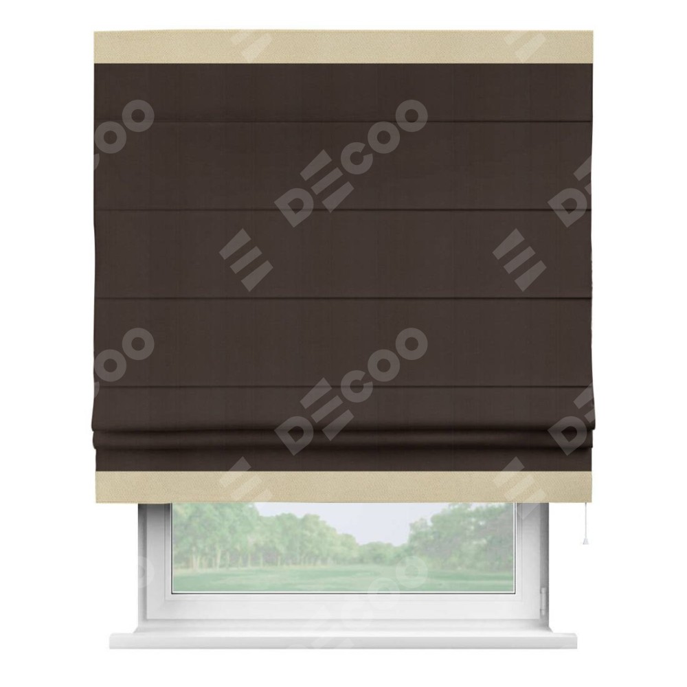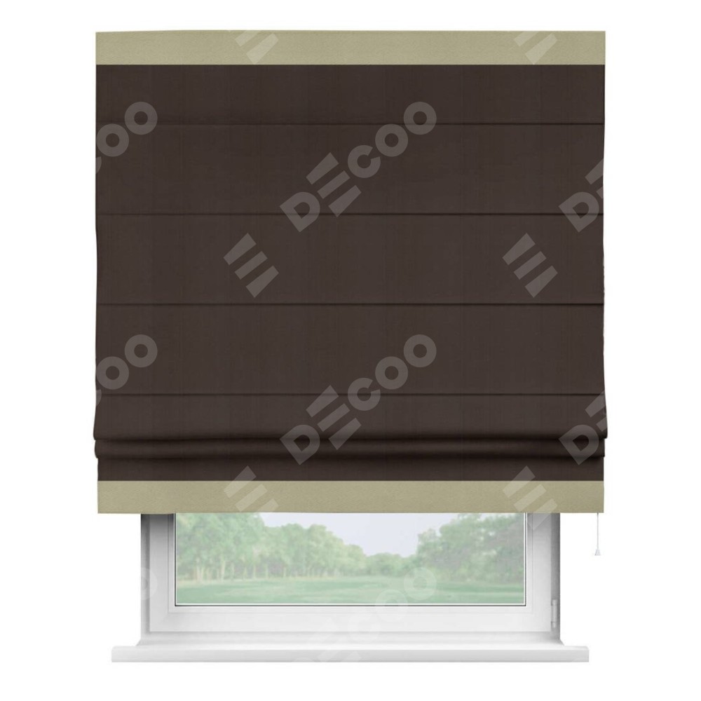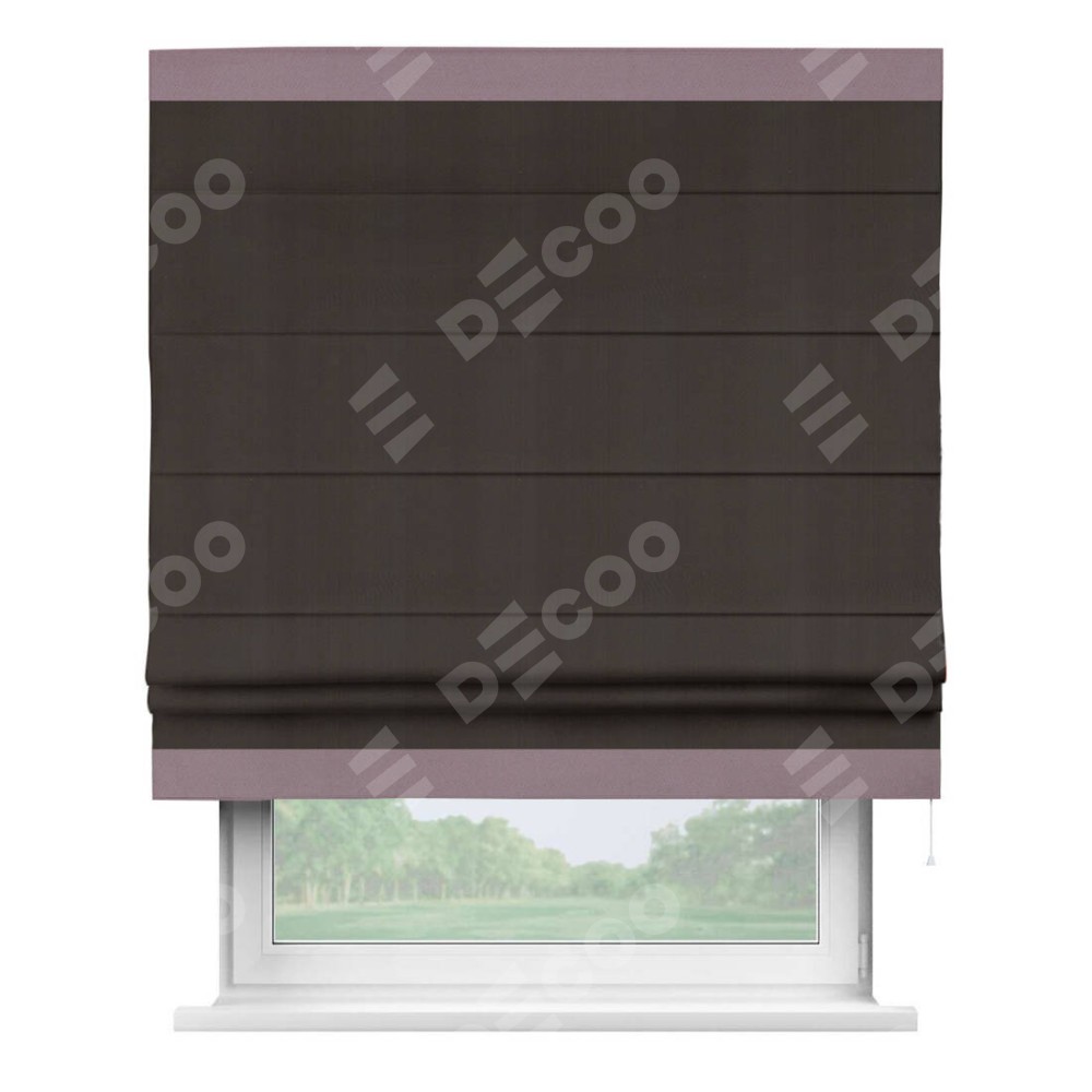 Римская штора производителя «Cortin», используется для проёма, пошита из ткани блэкаут однотонный венге, артикул ткани 88286. Отделка шторы кантом «Горизонт», ткань для канта используется из блэкаута однотонного разной расцветки на выбор. Имеет универсальный механизм и подходит для монтажа: на потолок, на стену и в нишу.