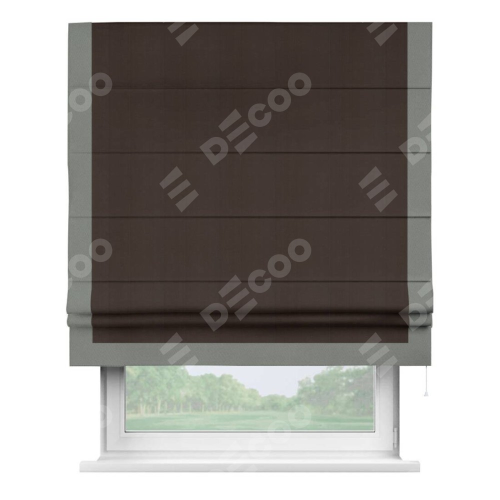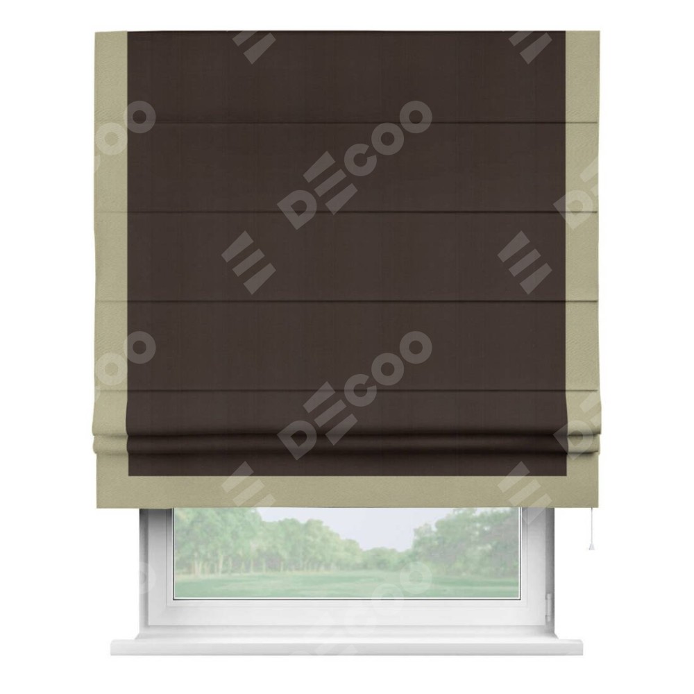 Римская штора производителя «Cortin», используется для проёма, пошита из ткани блэкаут однотонный венге, артикул ткани 88286. Отделка шторы кантом «Виктория», ткань для канта используется из блэкаута однотонного разной расцветки на выбор. Имеет универсальный механизм и подходит для монтажа: на потолок, на стену и в нишу.