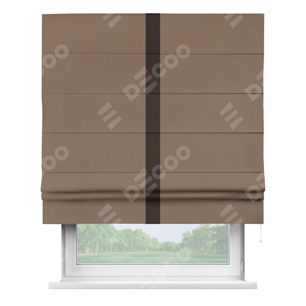 Римская штора производителя «Cortin», используется для проёма, пошита из ткани блэкаут однотонный коричневый, артикул ткани 88285. Отделка шторы кантом «Хайвей», ткань для канта используется из блэкаута однотонного разной расцветки на выбор. Имеет универсальный механизм и подходит для монтажа: на потолок, на стену и в нишу.