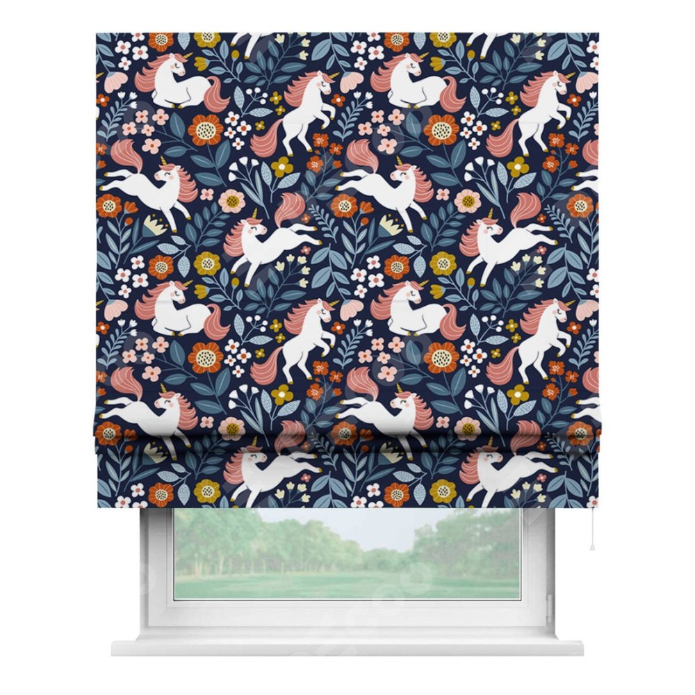 Римская штора производителя «Cortin», используется для проёма, пошита из ткани блэкаут с нанесением сублимационной печати «Цветы и единороги». Имеет универсальный механизм и подходит для монтажа: на потолок, на стену и в нишу.