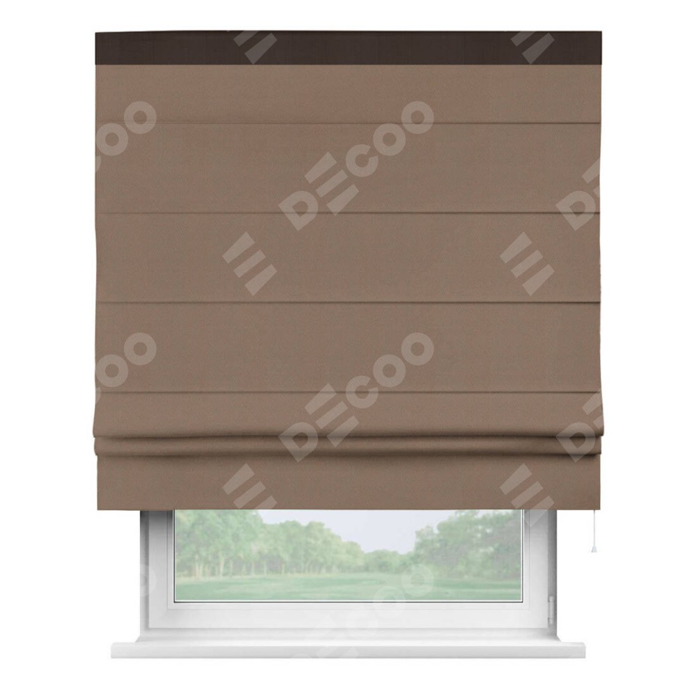 Римская штора производителя «Cortin», используется для проёма, пошита из ткани блэкаут однотонный коричневый, артикул ткани 88285. Отделка шторы кантом «Кинг», ткань для канта используется из блэкаута однотонного разной расцветки на выбор. Имеет универсальный механизм и подходит для монтажа: на потолок, на стену и в нишу.