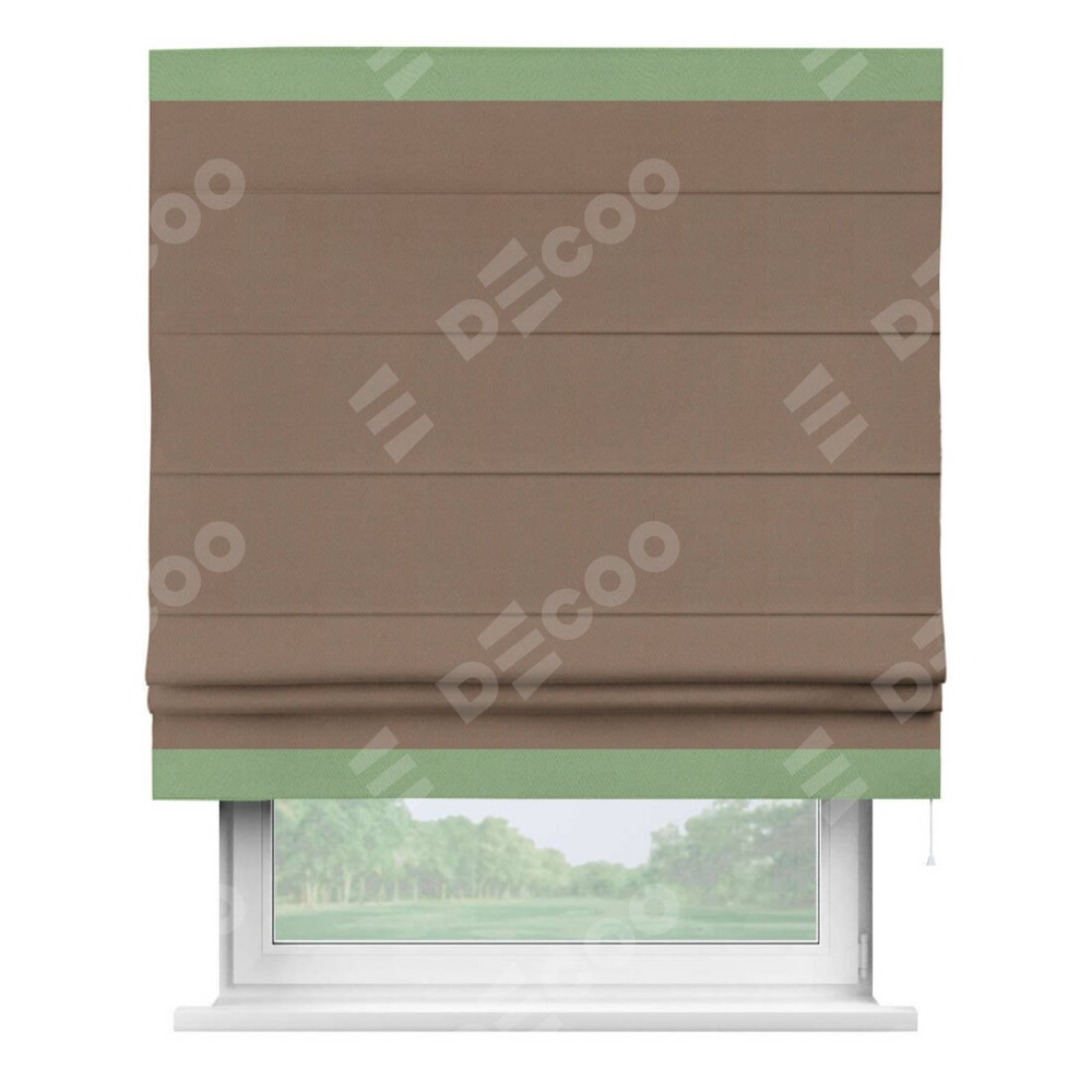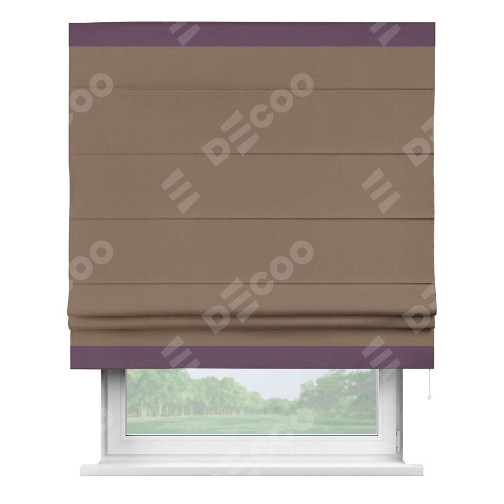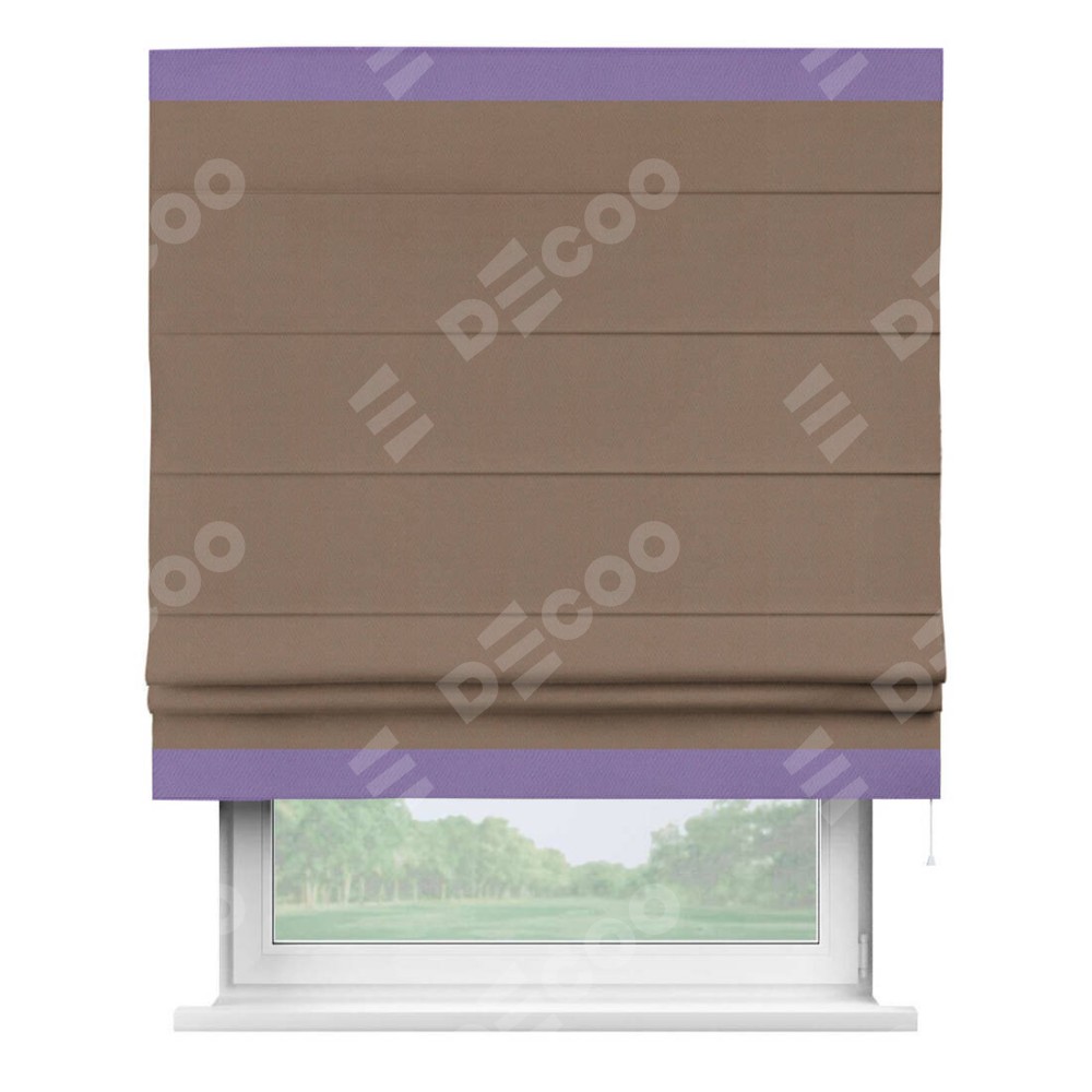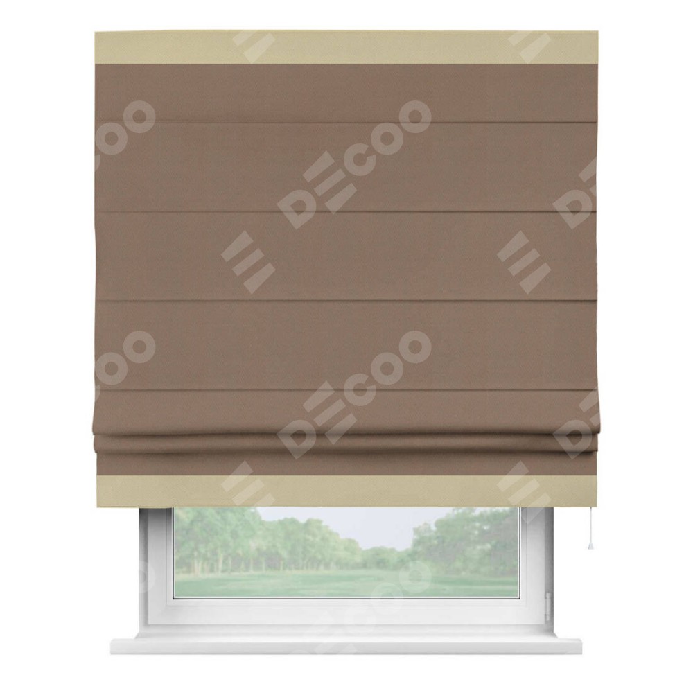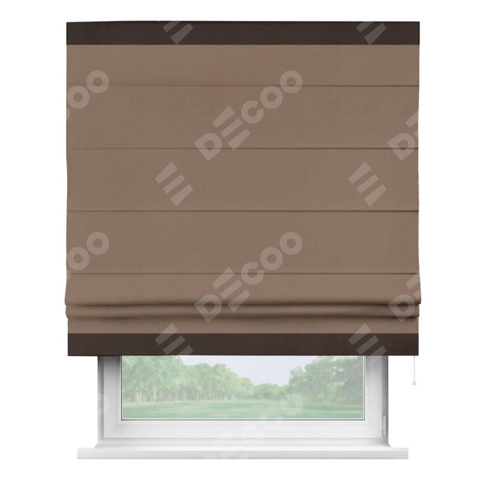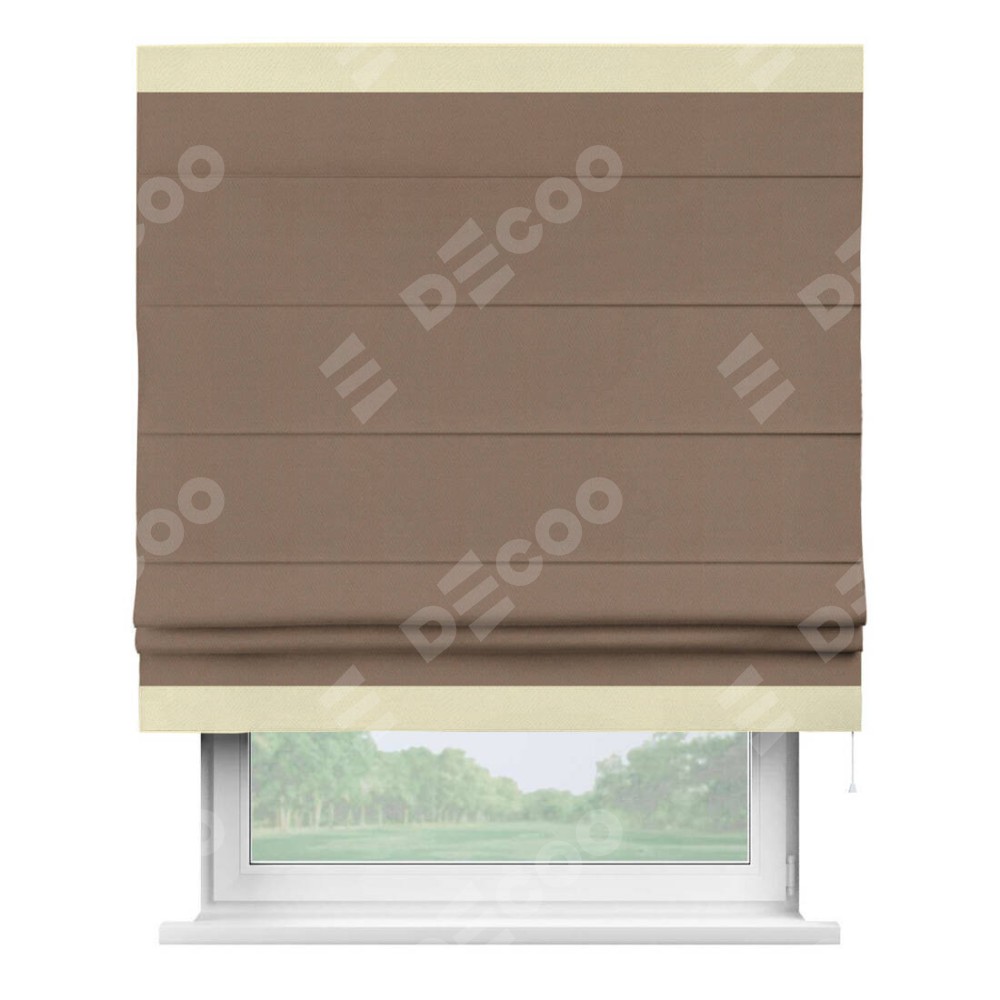 Римская штора производителя «Cortin», используется для проёма, пошита из ткани блэкаут однотонный коричневый, артикул ткани 88285. Отделка шторы кантом «Горизонт», ткань для канта используется из блэкаута однотонного разной расцветки на выбор. Имеет универсальный механизм и подходит для монтажа: на потолок, на стену и в нишу.