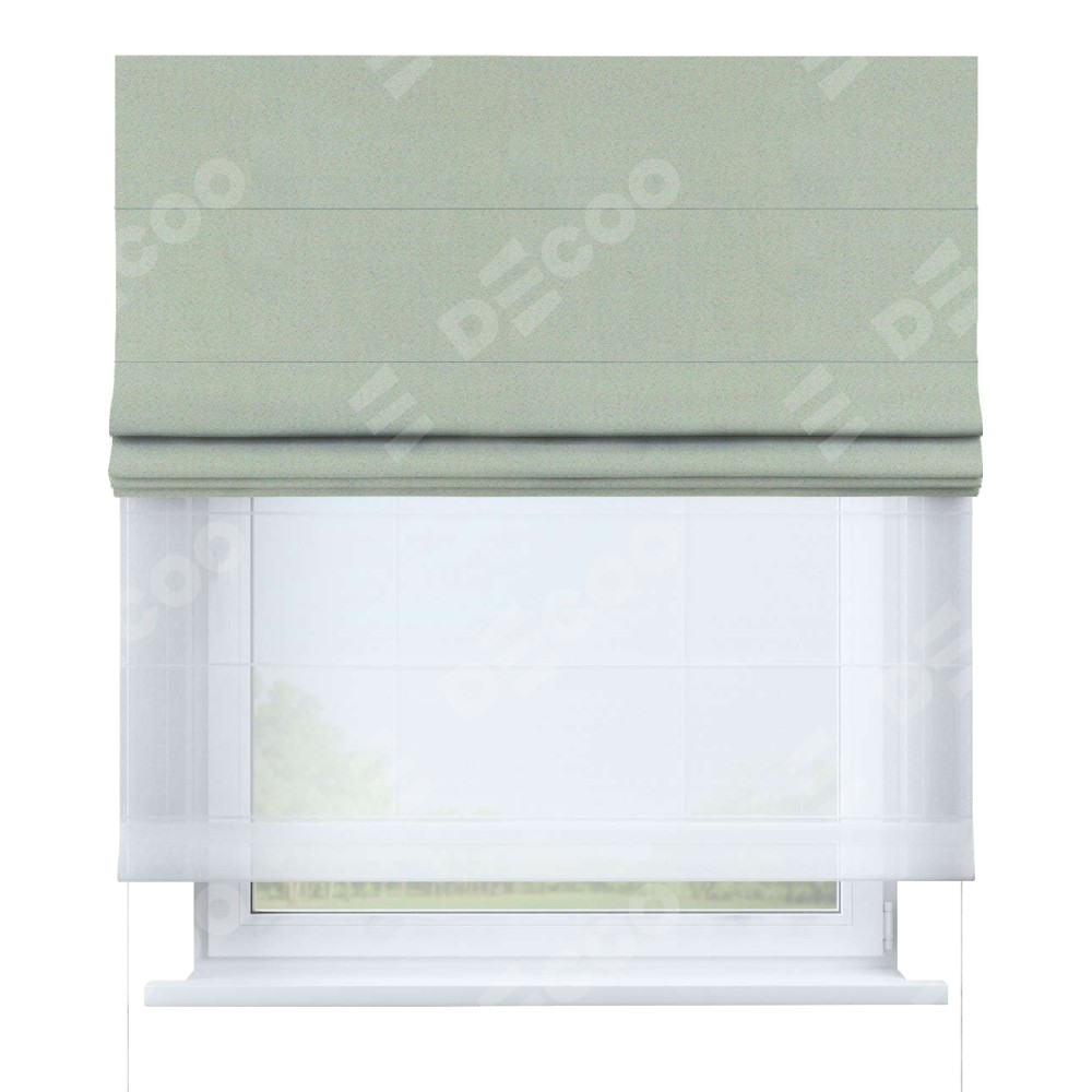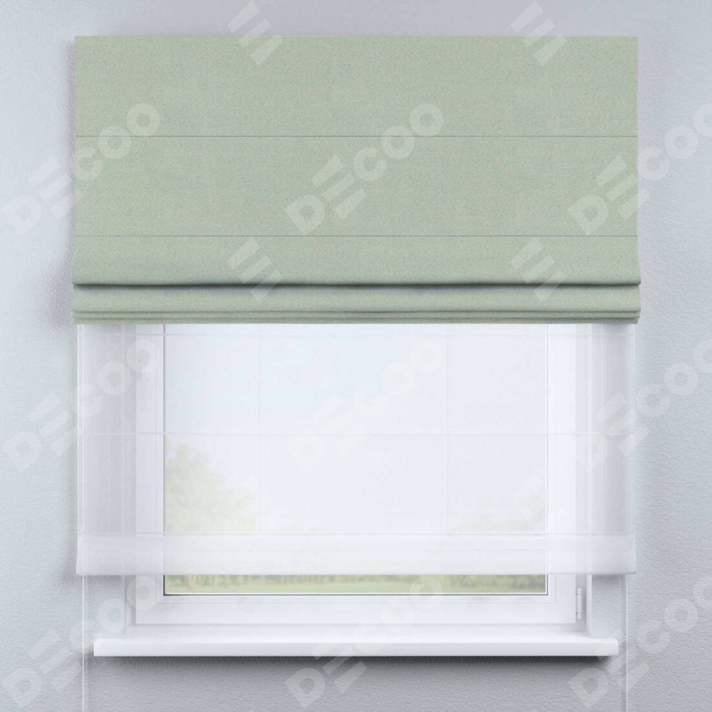 Римская штора день-ночь производителя «Cortin», используется для проёма, пошита из двух полотен, с лицевой стороны блэкаут однотонный светло-серый артикул 29332−2, вторая ткань тюль (по стандарту комплектуется тюль белого цвета артикул V-01). Имеет универсальный механизм и подходит для монтажа: на потолок, на стену и в нишу.