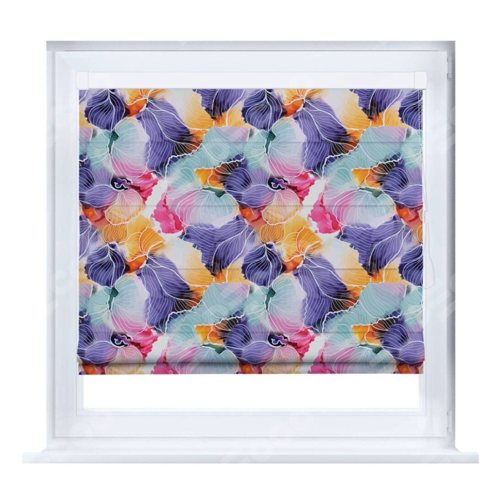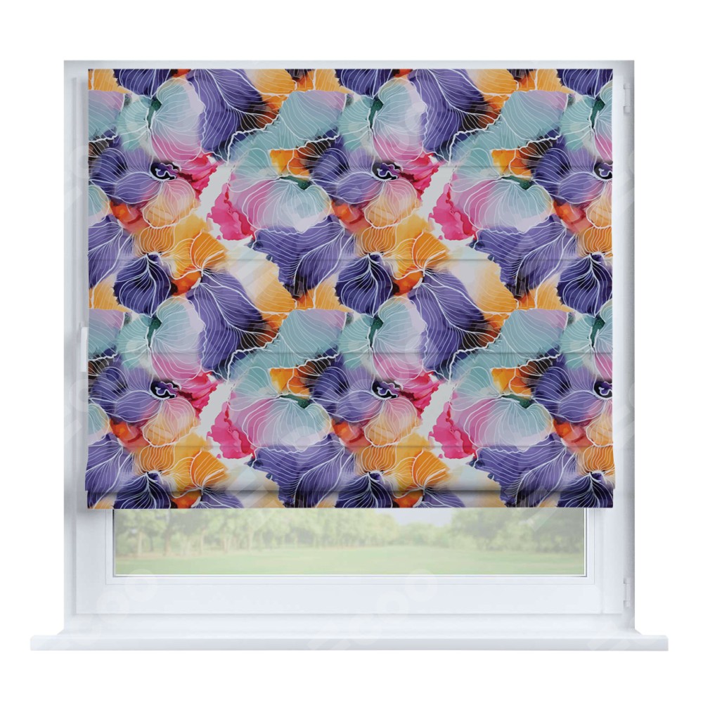 Римская штора производителя «Cortin», устанавливается на створку окна, пошита из ткани блэкаут с нанесением сублимационной печати «Роскошные ирисы». Штора шьётся по индивидуальным размерам, для данного типа римской шторы возможная ширина от 35 до 150 см., высота до 250 см.