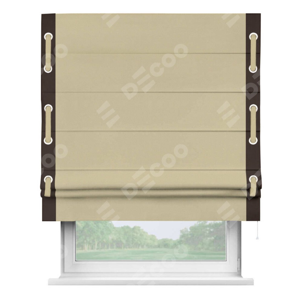 Римская штора производителя «Cortin», используется для проёма, пошита из ткани блэкаут однотонный кофейный, артикул ткани 13130. Отделка шторы кантом «Стрим Дуо» на кантах расположены люверсы с пояском, ткань для канта используется из блэкаута однотонного разной расцветки на выбор. Ткань для пояска обычно используется из основной ткани шторы, а так же можно сделать из любой расцветки по желанию. Имеет универсальный механизм и подходит для монтажа: на потолок, на стену и в нишу.
