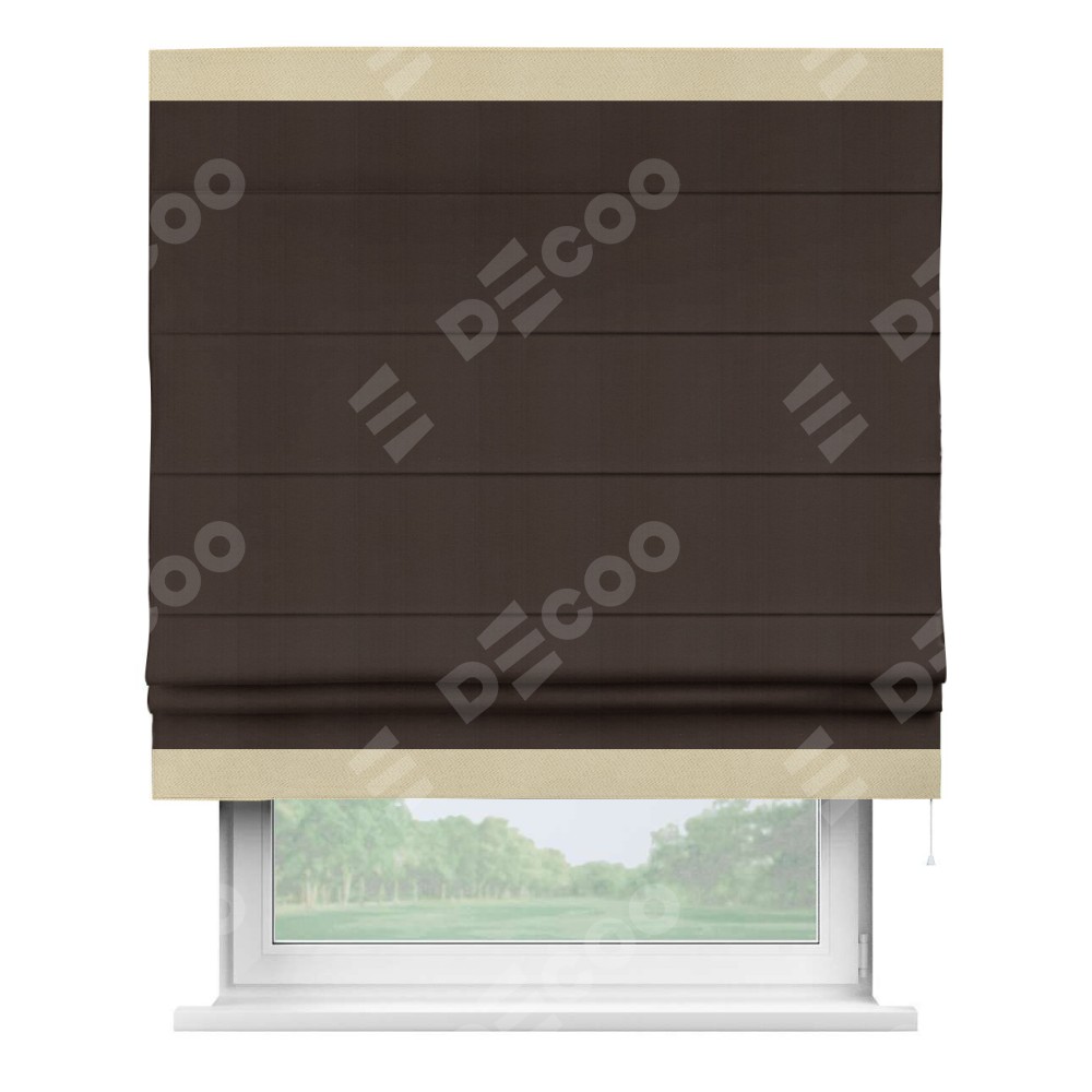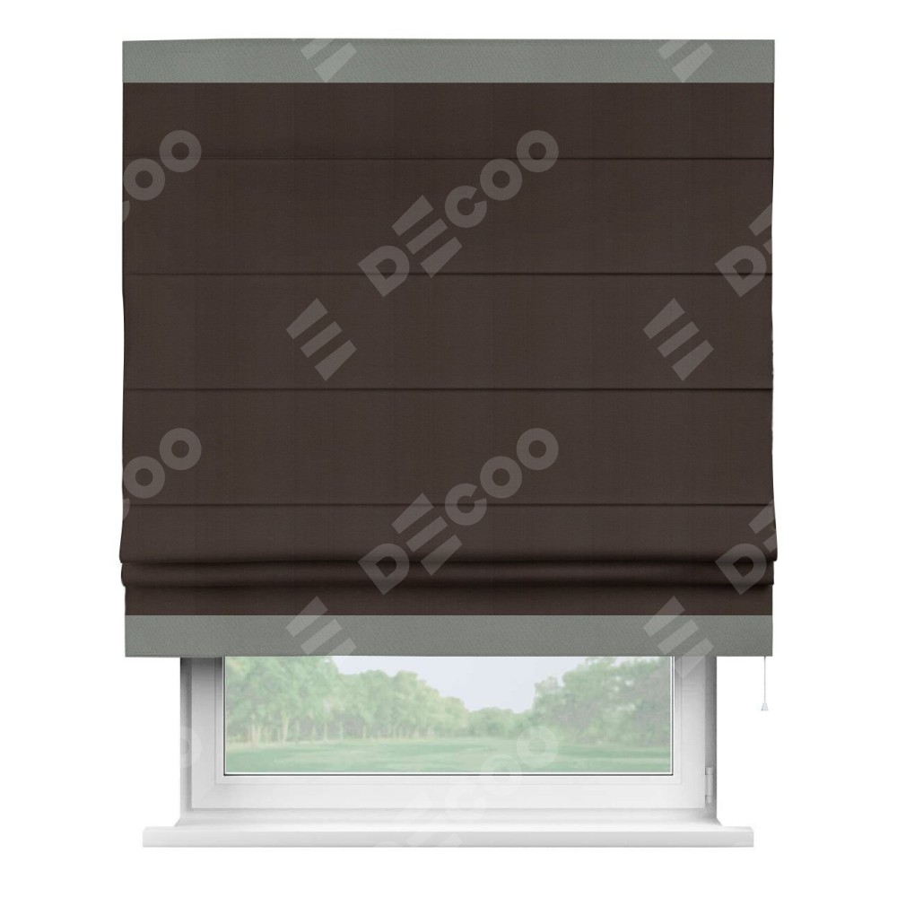 Римская штора производителя «Cortin», используется для проёма, пошита из ткани блэкаут однотонный тёмно-коричневый, артикул ткани 88287. Отделка шторы кантом «Горизонт», ткань для канта используется из блэкаута однотонного разной расцветки на выбор. Имеет универсальный механизм и подходит для монтажа: на потолок, на стену и в нишу.