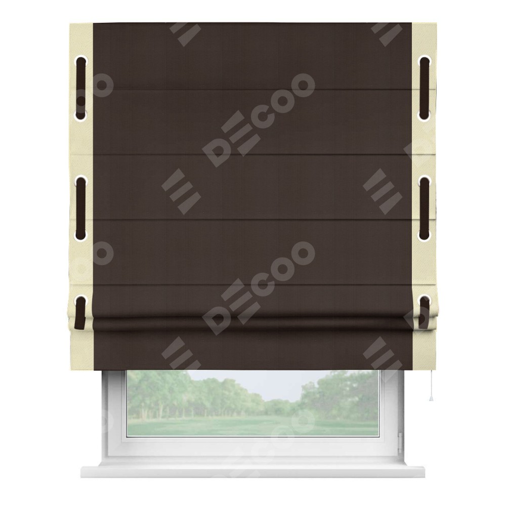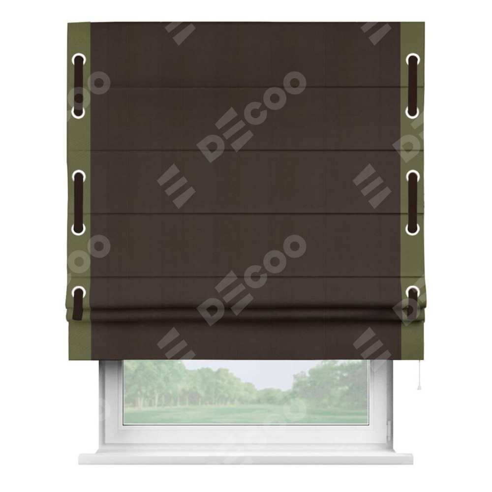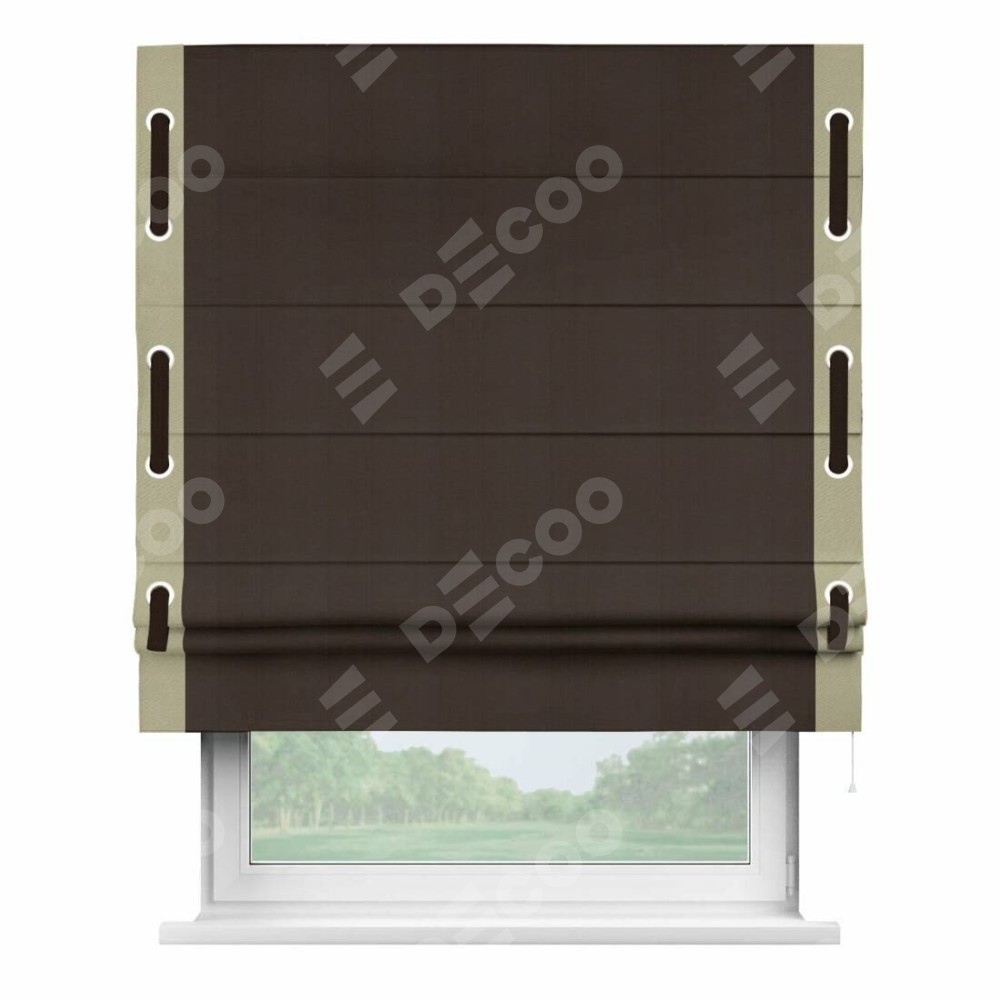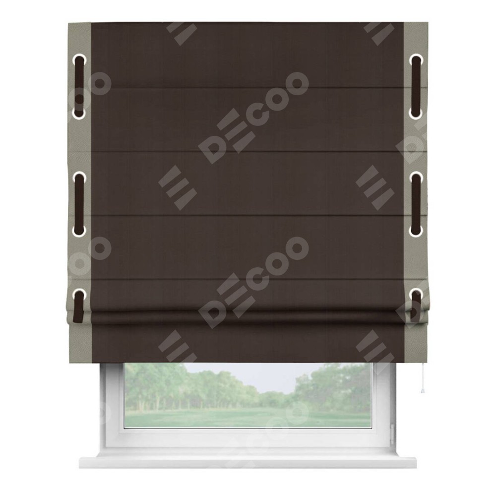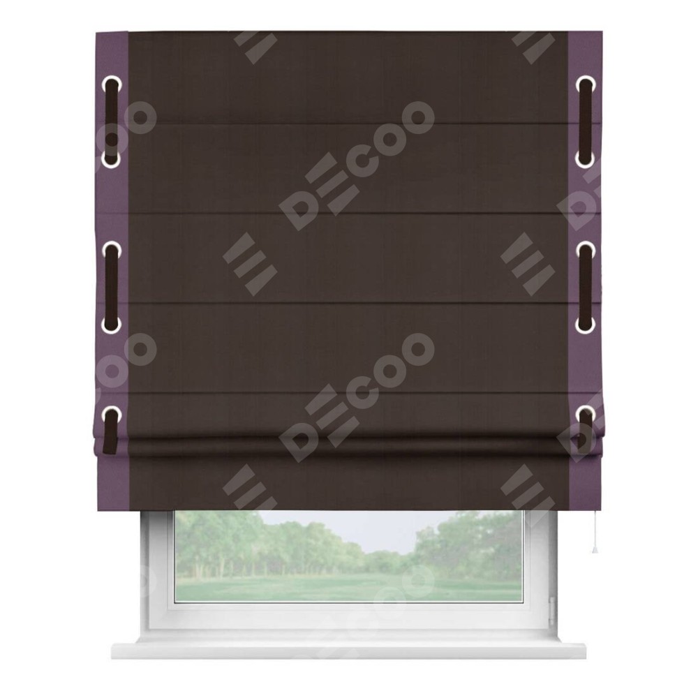 Римская штора производителя «Cortin», используется для проёма, пошита из ткани блэкаут однотонный тёмно-коричневый, артикул ткани 88287. Отделка шторы кантом «Стрим Дуо» на кантах расположены люверсы с пояском, ткань для канта используется из блэкаута однотонного разной расцветки на выбор. Ткань для пояска обычно используется из основной ткани шторы, а так же можно сделать из любой расцветки по желанию. Имеет универсальный механизм и подходит для монтажа: на потолок, на стену и в нишу.