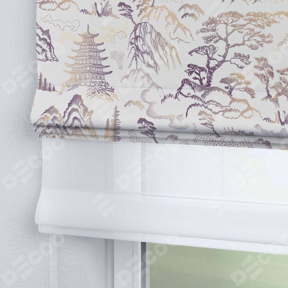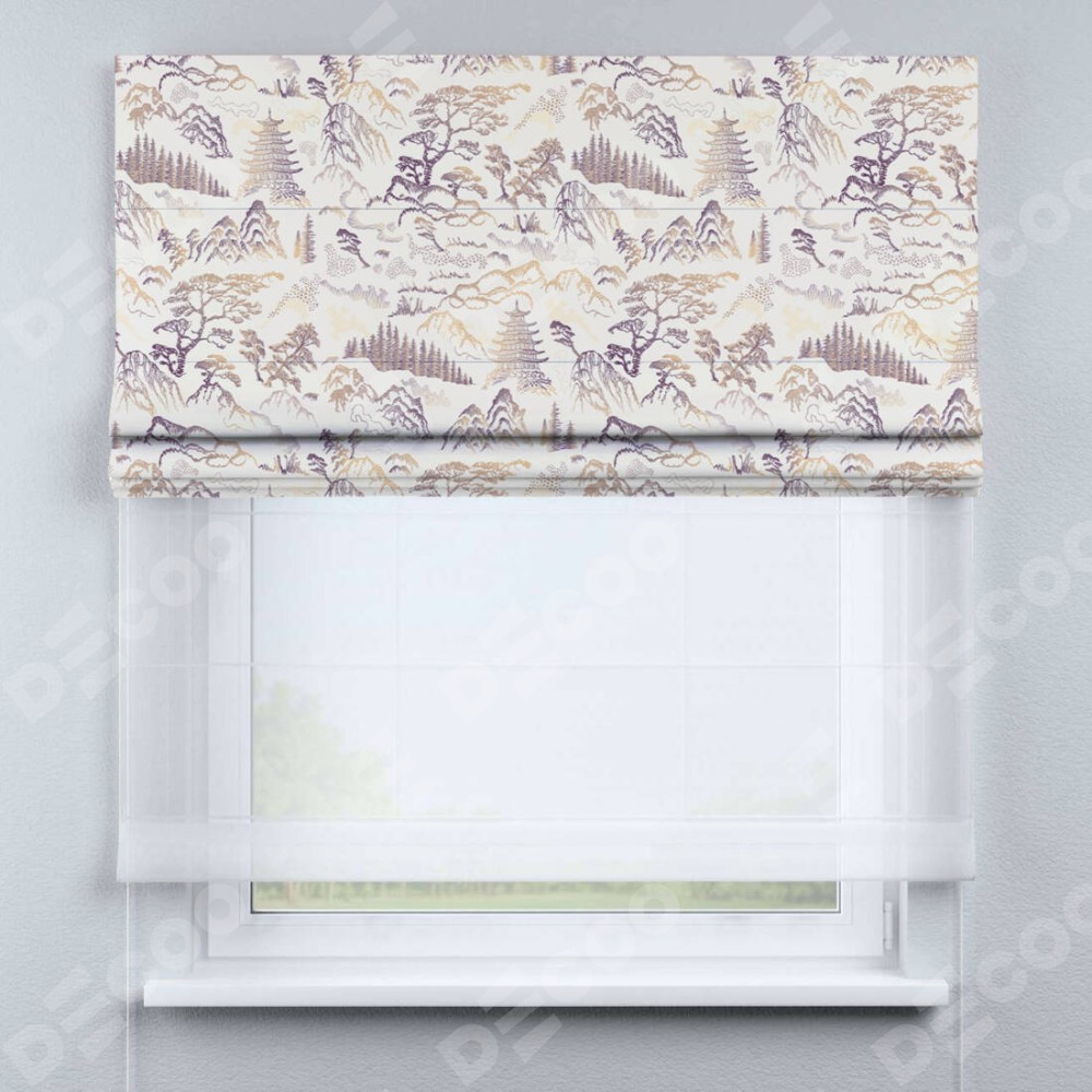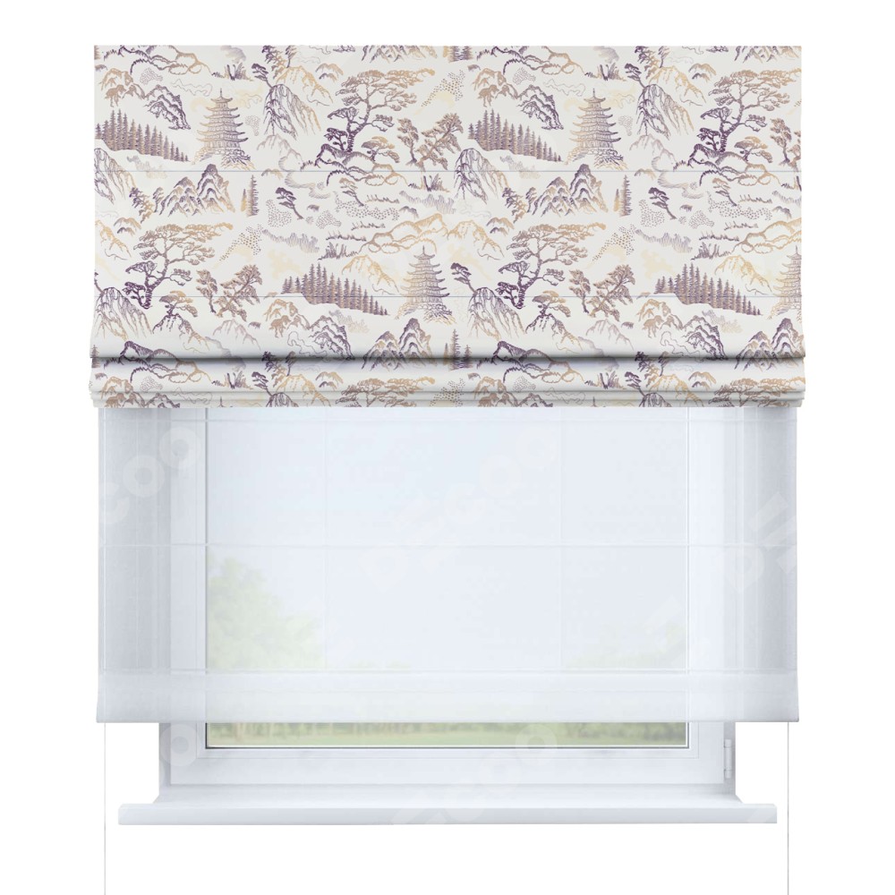 Римская штора день-ночь производителя «Cortin», используется для проёма, пошита из двух полотен, с лицевой блэкаут с нанесением сублимационной печати «Горные вершины», вторая ткань тюль (по стандарту комплектуется тюль белого цвета артикул V-01). Имеет универсальный механизм и подходит для монтажа: на потолок, на стену и в нишу.