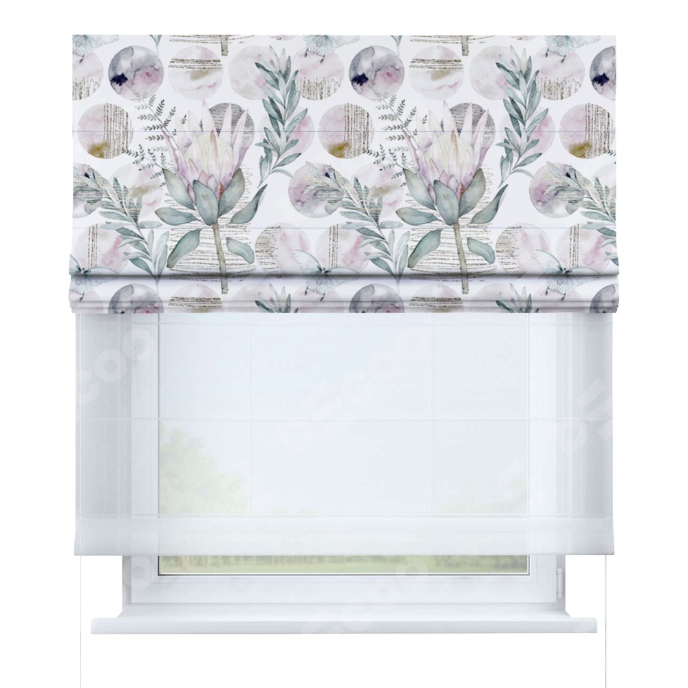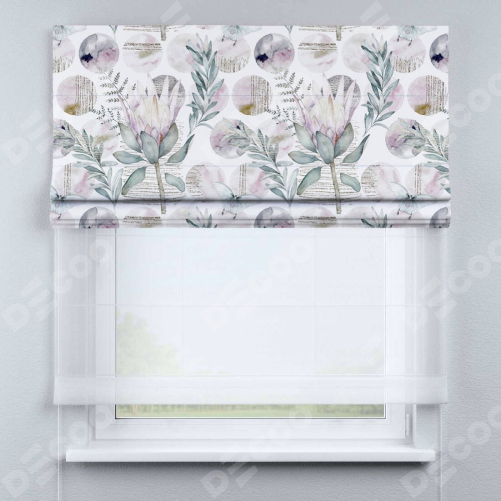 Римская штора день-ночь производителя «Cortin», используется для проёма, пошита из двух полотен, с лицевой блэкаут с нанесением сублимационной печати «Розовый лотос», вторая ткань тюль (по стандарту комплектуется тюль белого цвета артикул V-01). Имеет универсальный механизм и подходит для монтажа: на потолок, на стену и в нишу.