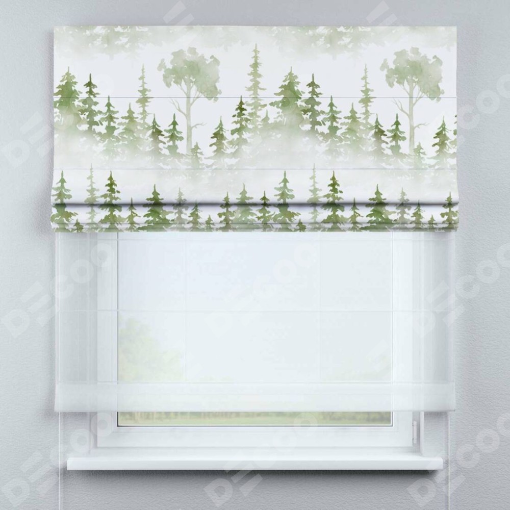 Римская штора день-ночь производителя «Cortin», используется для проёма, пошита из двух полотен, с лицевой блэкаут с нанесением сублимационной печати «Туманный лес», вторая ткань тюль (по стандарту комплектуется тюль белого цвета артикул V-01). Имеет универсальный механизм и подходит для монтажа: на потолок, на стену и в нишу.