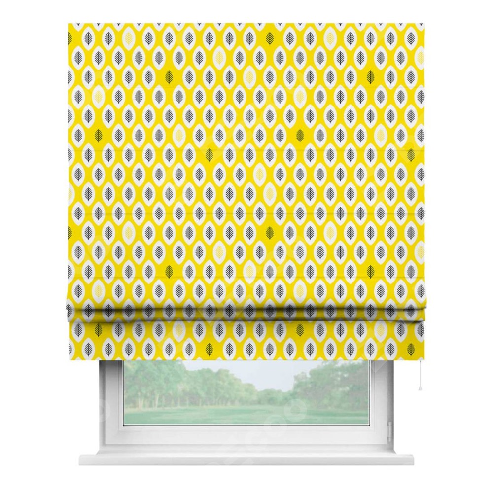 Римская штора производителя «Cortin», используется для проёма, пошита из ткани блэкаут с нанесением сублимационной печати «Солнечные листья». Имеет универсальный механизм и подходит для монтажа: на потолок, на стену и в нишу.