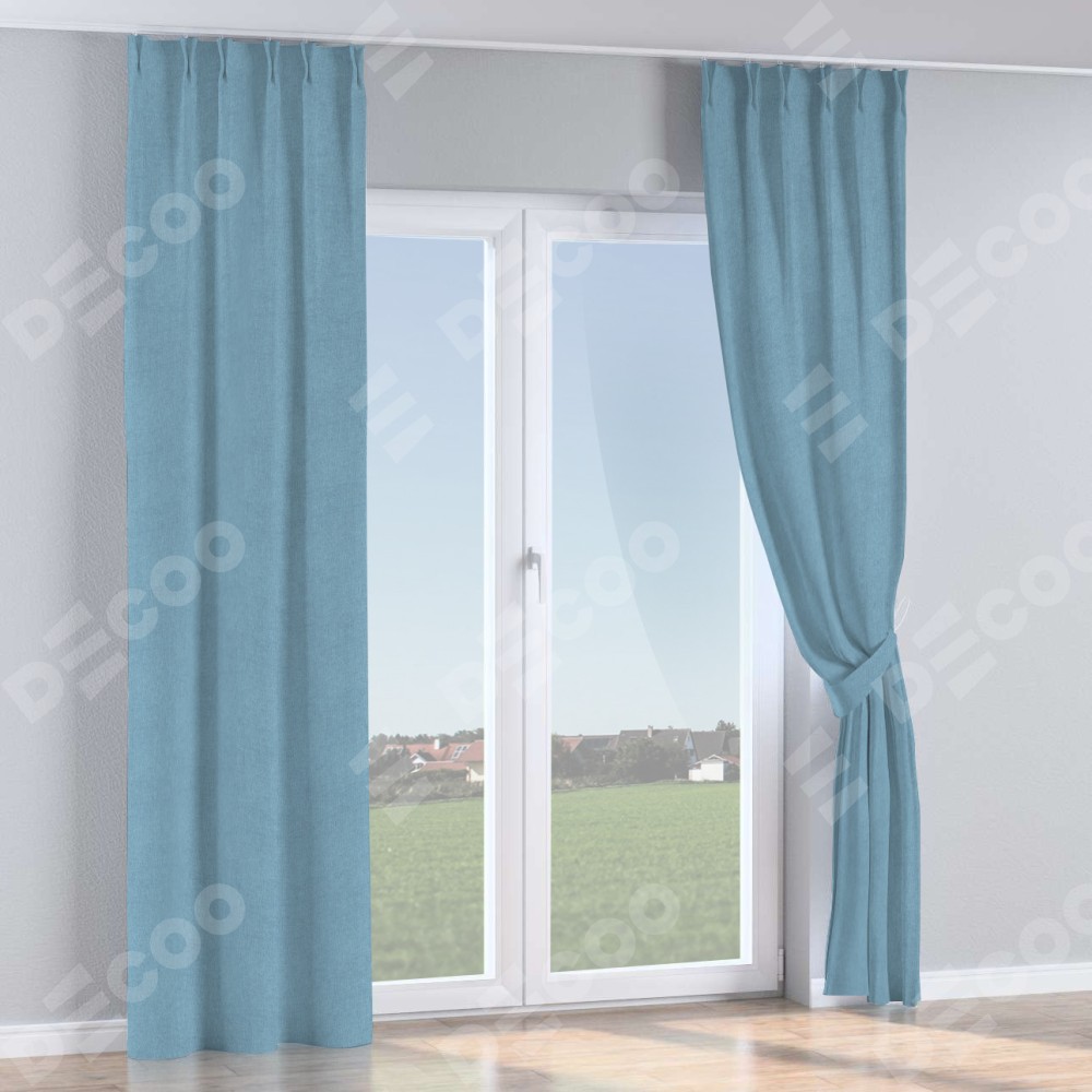 Комплект прямых штор, от производителя «Cortin», пошиты из ткани лён блэкаут голубой, артикул ткани 69574. С изнаночной стороны в верхней части штор пристрачивается шторная лента с декоративными складками «Кустик». Для создания элегантных складок прямые шторы шьются по стандарту с коэффициентом 1:2 (на 100 см. ширины проёма 200 см. ширины ткани).