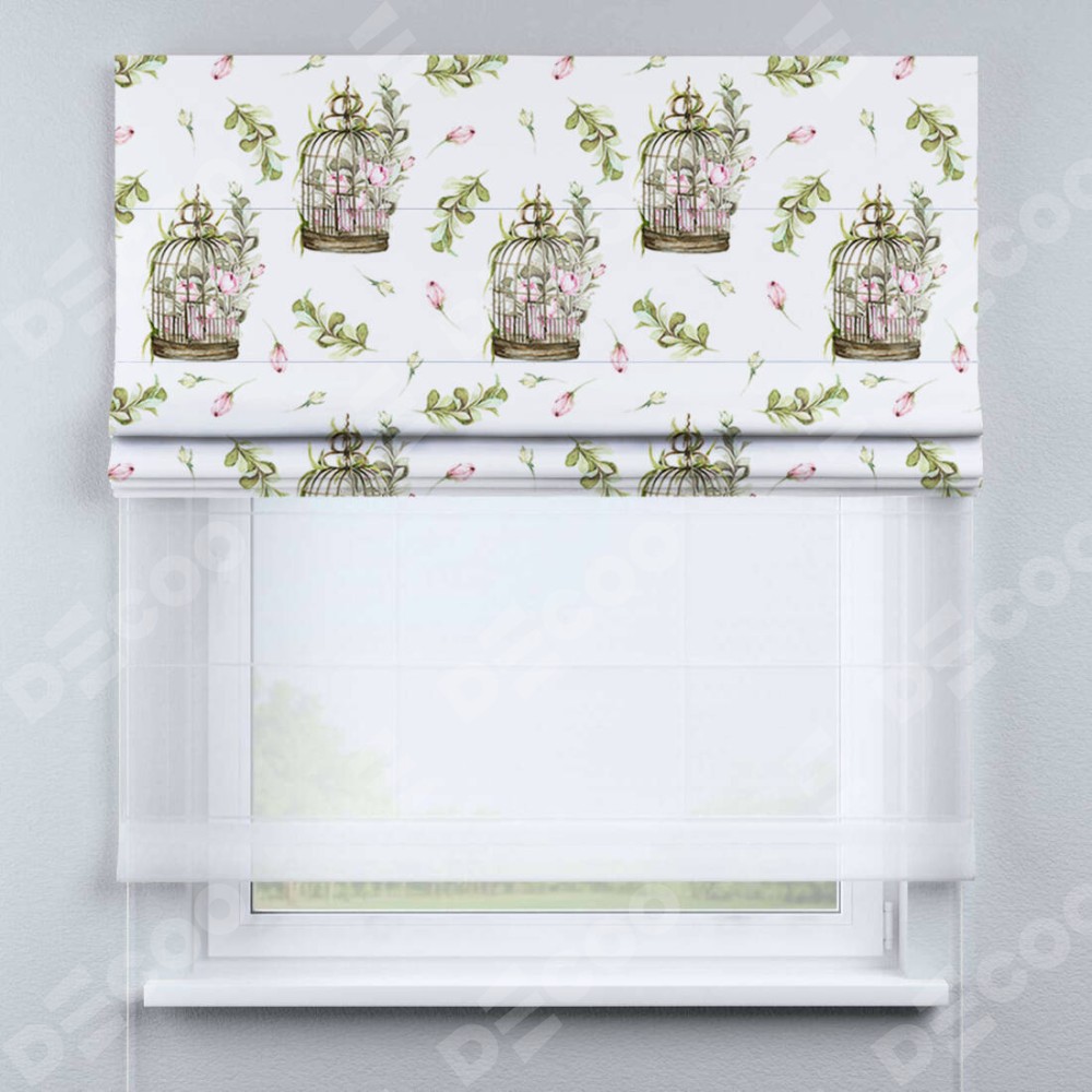 Римская штора день-ночь производителя «Cortin», используется для проёма, пошита из двух полотен, с лицевой блэкаут с нанесением сублимационной печати «Летний прованс», вторая ткань тюль (по стандарту комплектуется тюль белого цвета артикул V-01). Имеет универсальный механизм и подходит для монтажа: на потолок, на стену и в нишу.