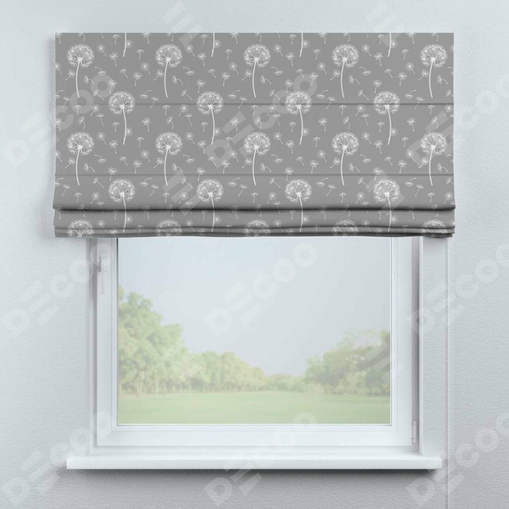 Римская штора производителя «Cortin», используется для проёма, пошита из ткани блэкаут с нанесением сублимационной печати «Одуванчики». Имеет универсальный механизм и подходит для монтажа: на потолок, на стену и в нишу.