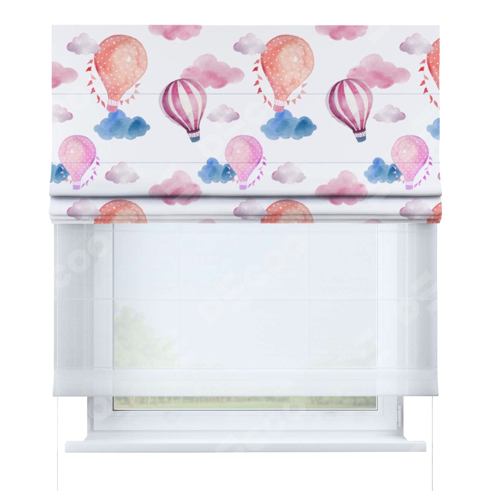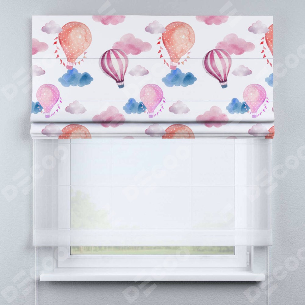Римская штора день-ночь производителя «Cortin», используется для проёма, пошита из двух полотен, с лицевой блэкаут с нанесением сублимационной печати «Полёт в облаках», вторая ткань тюль (по стандарту комплектуется тюль белого цвета артикул V-01). Имеет универсальный механизм и подходит для монтажа: на потолок, на стену и в нишу.