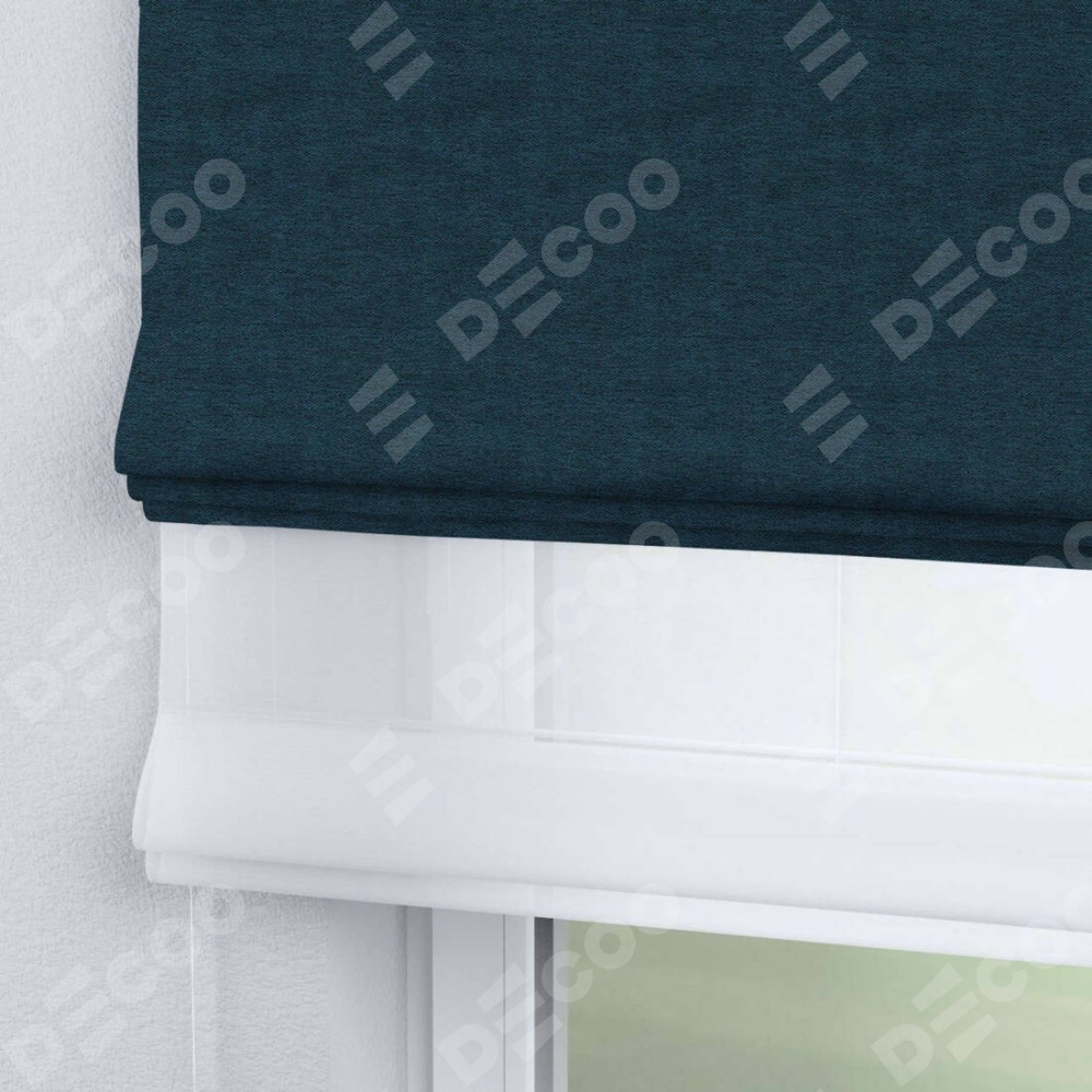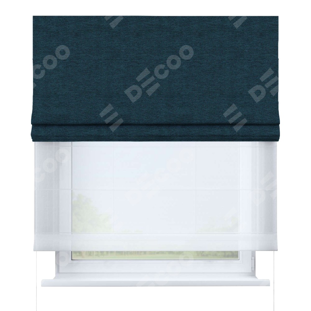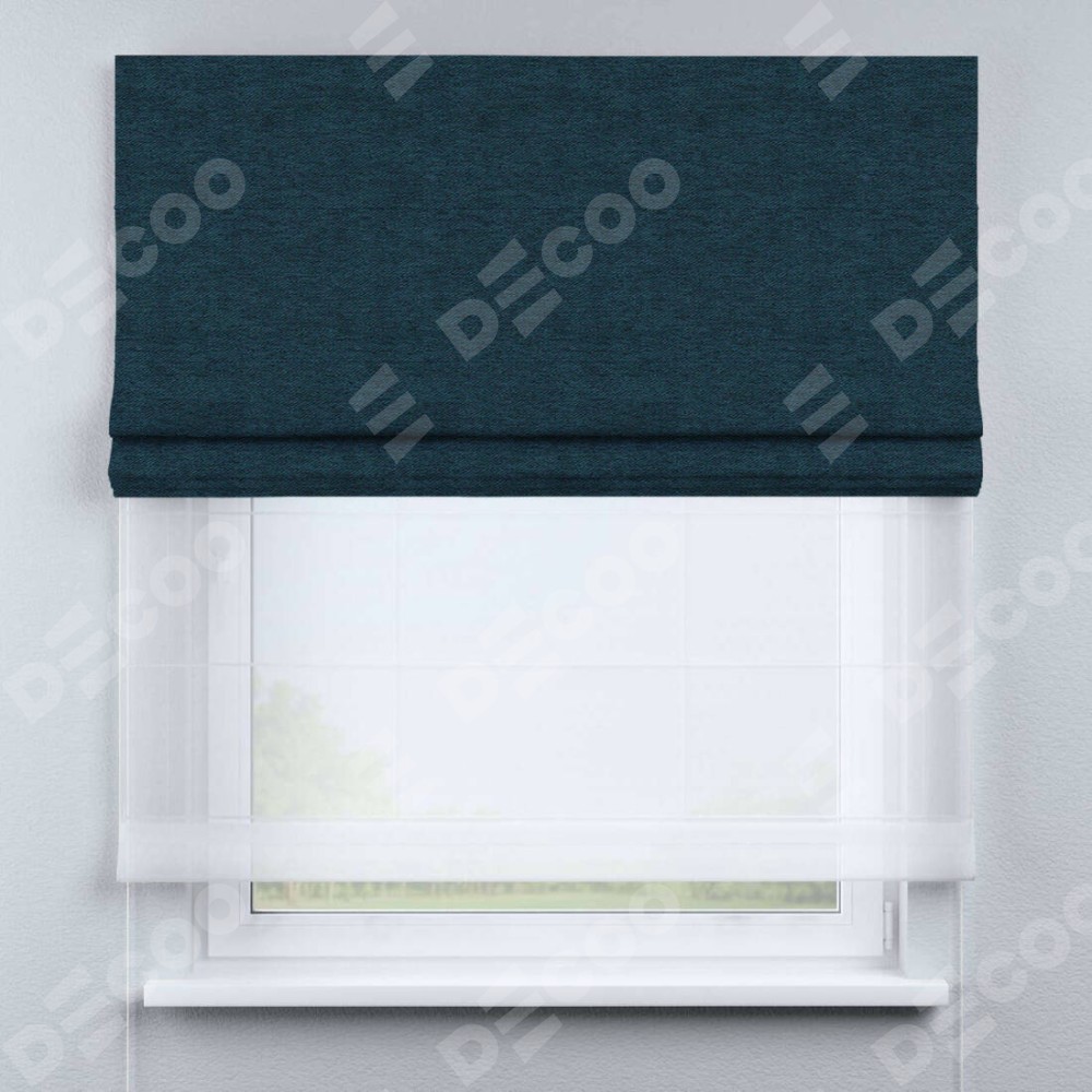 Римская штора день-ночь производителя «Cortin», используется для проёма, пошита из двух полотен, с лицевой стороны твид блэкаут глубокий синий артикул 21590, вторая ткань тюль (по стандарту комплектуется тюль белого цвета артикул V-01). Имеет универсальный механизм и подходит для монтажа: на потолок, на стену и в нишу.